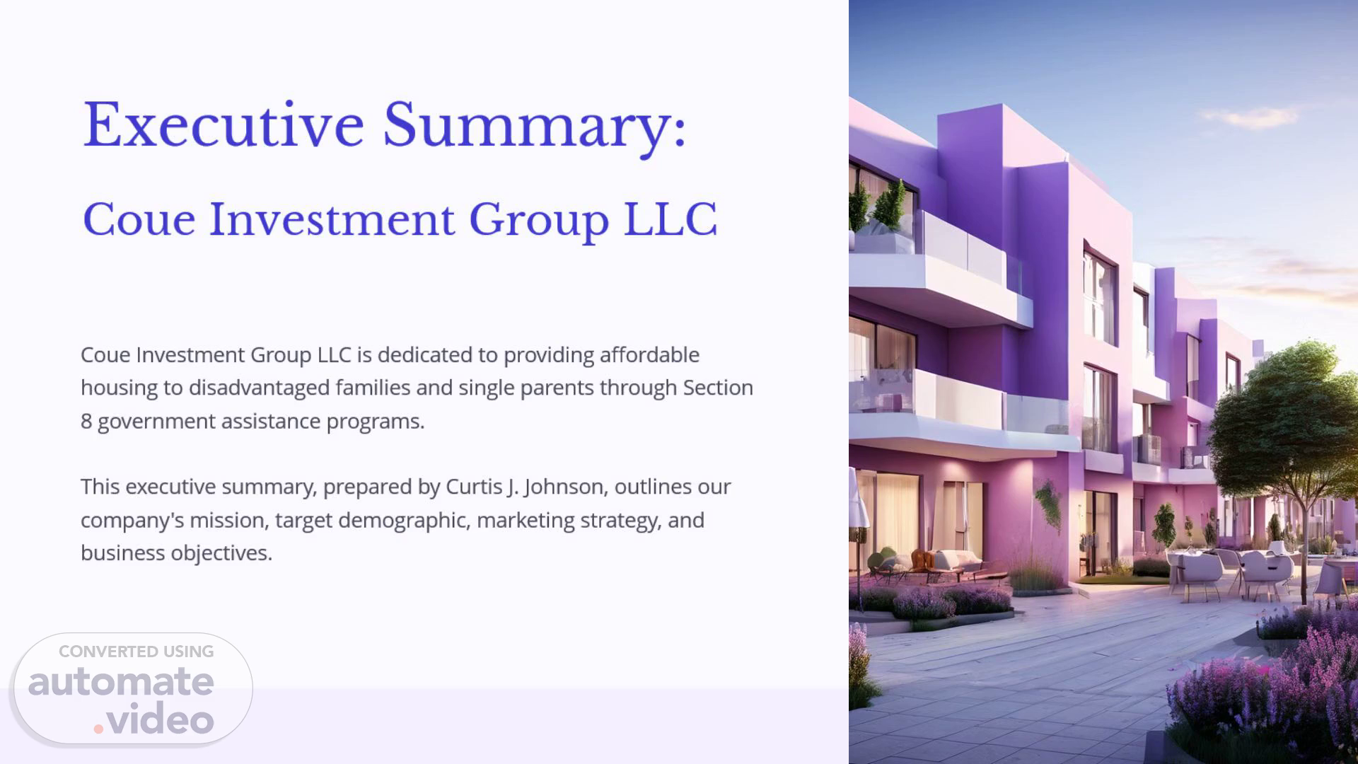 [Audio] Coue Investment Group L-L-C is dedicated to providing affordable housing to disadvantaged families and single parents through Section 8 government assistance programs. The company focuses on offering quality single-family homes and multifamily apartments in upper to middle-class neighborhoods. Coue Investment Group L-L-C aims to address the housing needs of low-to-moderate-income families particularly single parents by providing stable secure and affordable housing options..