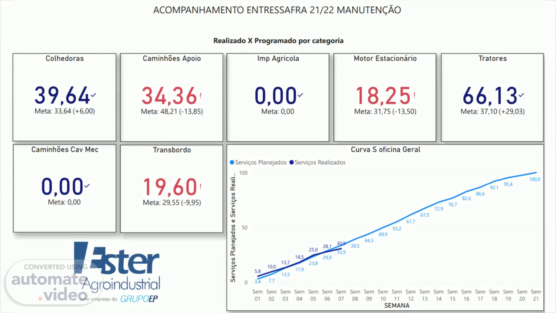 ACOMPANHAMENTO ENTRESSAFRA 21/22 MANUTENCÄO Realizado X Programado por categoria Colhedoras 39,64 Meta: 33,64 (+6,00) Caminhöes Cav Mec o,oo Meta: O,OO Caminhöes Apoio 34,36 Meta: 48,21 13,85) Transbordo 1 9,60 Meta: 29,55 (-9,95) Imp Agricola o,oo Meta: O,OO Servicos Planejados Motor Estacionårio 18,25 Meta: 31,75 (-13,50) Curva S oficina Geral Servicos Realizados Tratores 66,13 Meta: 37,10 (+29,03) 100,0 95,4 92,1 86.6 82,6 76.7 72,9 l*ter Agroindushial umo empreso do o o 50 Sem 01 10.0 Sem 02 13.7 13.5 Sem 03 18,5 17,9 Sem 04 25.0 23,8 Sem 05 28, 1 29,0 Sem 06 3 33.9 Sem 07 39.5 Sem 08 44, 3 Sem 09 67,5 61.7 55,2 49.9 Sem Sem Sem Sem Sem Sem Sem Sem Sem Sem Sem Sem 12 13 14 15 16 17 18 19 20 21 10 11 SEMANA.