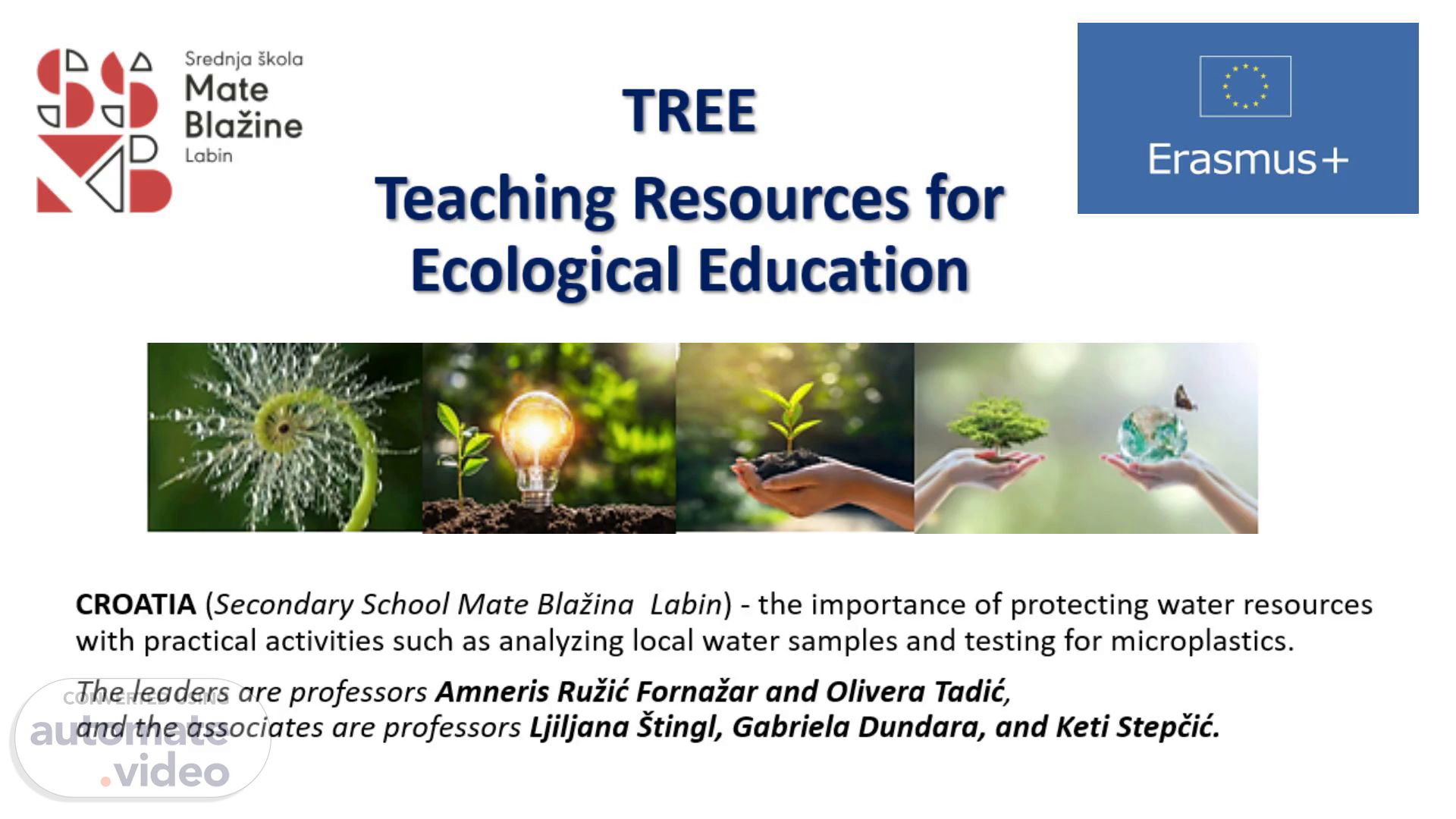 [Audio] TREE Teaching Resources for Ecological Education CROATIA (Secondary School Mate Blažina Labin) - the importance of protecting water resources with practical activities such as analyzing local water samples and testing for microplastics. The leaders are professors Amneris Ružić Fornažar and Olivera Tadić, and the associates are professors Ljiljana Štingl, Gabriela Dundara, and Keti Stepčić. Hello, I am Olivera. Welcome to our Erasmus+ project in Labin. The main focus of our work is ecological education, especially water protection and the impact of microplastics. Our goal is to raise environmental awareness and develop practical skills in sustainability." This project is hosted by Secondary School Mate Blažina in Labin, Croatia. The leading professors are Amneris Ružić Fornažar and Olivera Tadić, with the support of colleagues Ljiljana Štingl, Gabriela Dundara, and Keti Stepčić. Together, we will guide you through fieldwork and laboratory activities..
