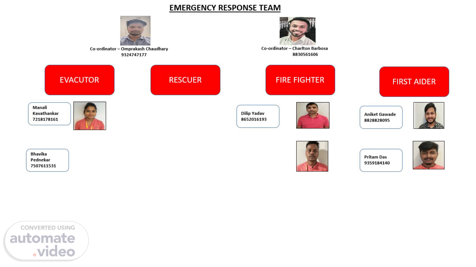 [Audio] EMERGENCY RESPONSE TEAM Co-ordinator – Charlton Barbosa 8830561606 Co-ordinator – Omprakash Chaudhary 9324747177 EVACUTOR RESCUER FIRE FIGHTER FIRST AIDER Manali Kavathankar 7218178161 Dilip Yadav 8652016193 Lalita Morye 9699744738 Aniket Gawade 8828828095 Sumeisha Insulkar 7798268316 Bhavika Pednekar 7507611531 Manali Kavathankar 7218178161 Pritam Das 9359184140 Nidhi Gargacharya 8156028008 Pradnya Dhuri 9146911703 Abhishek Sawant 9545579041 Digambar 7030986716 Mrunmayi Mestri 9922594616 Rajat Senapati 8249263957 Nimesh Kshirsagar 7385415411 Shaheen Malgatti 9370667902.