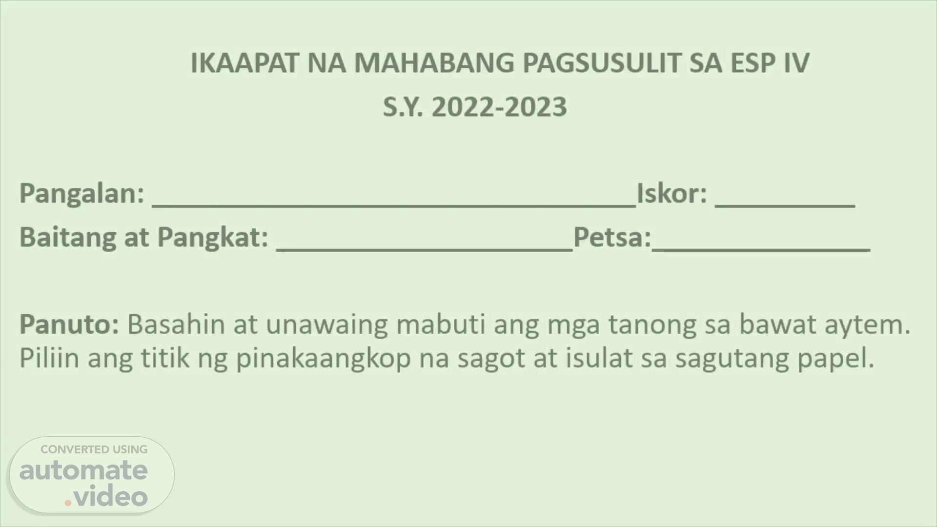 IKAAPAT NA MAHABANG PAGSUSULIT SA ESP IV S.Y. 2022-2023 Pangalan : _______________________________ Iskor : _________ Baitang at Pangkat : ___________________ Petsa :______________ Panuto : Basahin at unawaing mabuti ang mga tanong sa bawat aytem . Piliin ang titik ng pinakaangkop na sagot at isulat sa sagutang papel ..