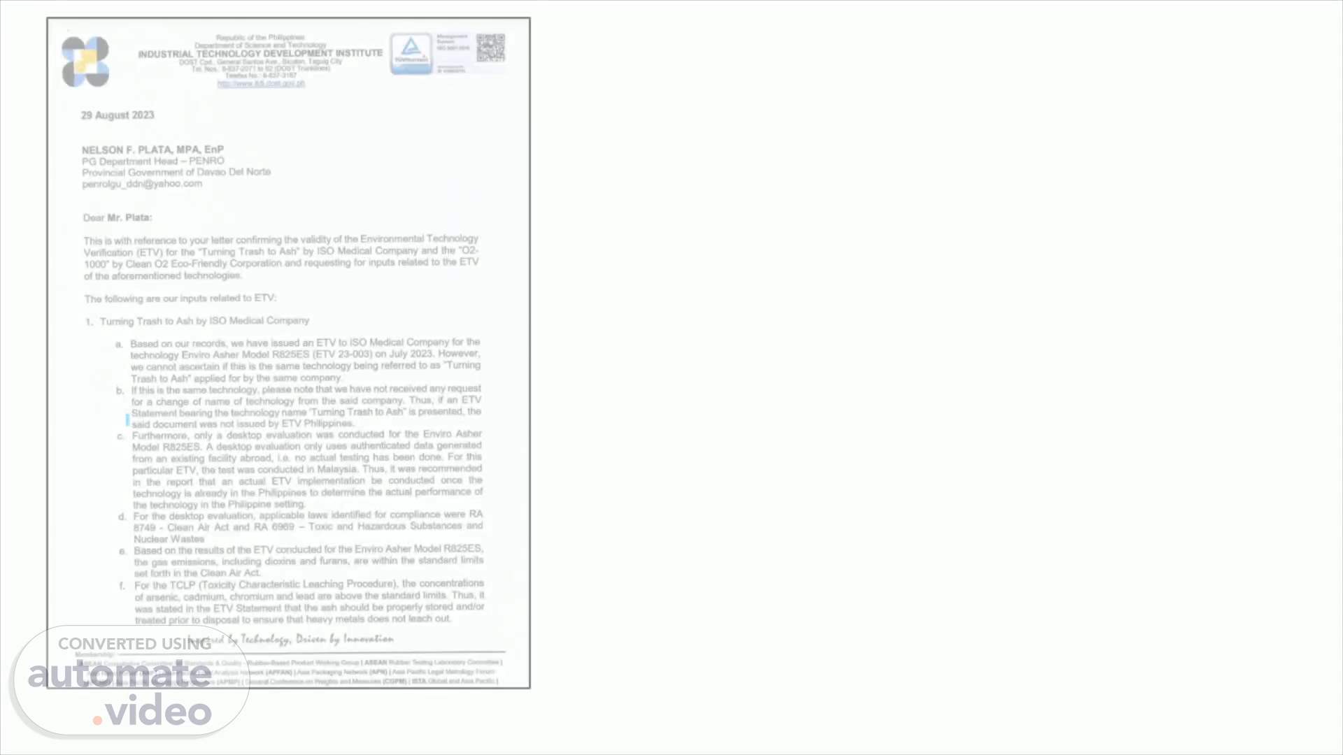 wouSTRtAL T 29 August 2023 NELSON F. PLATA, MPA Enp pc - PENRO GovMnrnent ot o.ar Mr. Plata: Thb With to you letter the v ot En-v*Mmental (E TV) for tho to Ash • by ISO Medical the •02- by Clean 02 for to ETV of tho inputs to ETV : 1. T T rash Ash by ISO a records, have ETV to SO Model RB25ES (ETV 23-003) July 2023, H—er. we this is the same referred to as Trash to Ash" by the same b this any o' the Thus. if an ETV the T Tragh Ash' is the Was rot by ETV Philips*nos. c. a Was Env'O Asher RB2SES_ A only uses data from exating i. no actual this particular E TV. test conducted in Malaysia that an ETV imphrnentaticm is already in Ph"ppiMS to detemir* o' in d. For the dnktop applicable were RA - Clæn A" Act and — HaZ&dCRZS Substarx;es e. Bawd on rBkAtS Ot ETV the Asher R825ES. 'wans. Within the limitg tie gu emi get k*th in A. Act. For the TCLP goridty CharacteristÉ Leach cadmiLm. and iead Me starOtd limits. it in the ETV Stat—it that tho ash and/or prW to tmt out..
