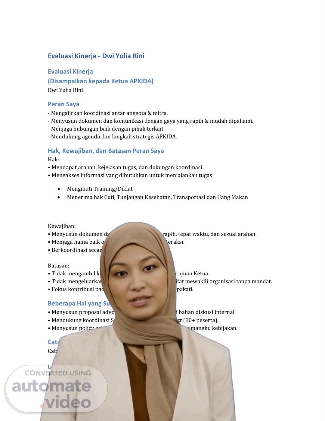 [Virtual Presenter] Selamat datang di sesi evaluasi kinerja, Dwi Yulia Rini. Saya akan menjelaskan peran dan tanggung jawab saya dalam APKIDA kepada Ketua APKIDA. Sebagai anggota, tugas saya meliputi mengoordinasikan kerja dengan anggota dan mitra, menyusun dokumen dan berkomunikasi dengan gaya yang rapi dan mudah dipahami, menjaga hubungan yang baik dengan pihak terkait, serta mendukung agenda dan langkah strategis APKIDA. Saya memiliki hak untuk menerima arahan dan penjelasan tugas, serta dukungan koordinasi. Saya juga berhak untuk mengakses informasi yang dibutuhkan untuk melaksanakan tugas, mengikuti pelatihan, dan menerima hak cuti, tunjangan kesehatan, transportasi, dan uang makan. Namun, saya juga memiliki kewajiban untuk menyusun dokumen dan berkomunikasi secara rapi dan sesuai arahan. Saya juga harus menjaga nama baik organisasi dalam setiap interaksi dan berkoordinasi secara aktif dan terbuka. Ada beberapa batasan dalam peran saya, seperti tidak boleh mengambil keputusan strategis tanpa persetujuan dari Ketua dan tidak boleh membuat pernyataan publik yang mewakili organisasi tanpa izin. Saya juga harus fokus pada kontribusi saya dalam ruang tugas yang telah disepakati. Saya telah melakukan beberapa kegiatan, seperti menyiapkan proposal advokasi yang digunakan untuk diskusi internal, mendukung koordinasi seminar Knowledge Product dengan lebih dari 80 peserta, dan menyusun policy brief yang digunakan sebagai dasar dialog dengan pemangku kebijakan. Namun, terdapat catatan yang perlu diperbaiki, yaitu kurangnya keseragaman komunikasi antara anggota. Untuk itu, saya sudah menyiapkan langkah-langkah yang akan saya lakukan, seperti menyusun alur komunikasi internal yang lebih sederhana. Terima kasih atas perhatiannya.".
