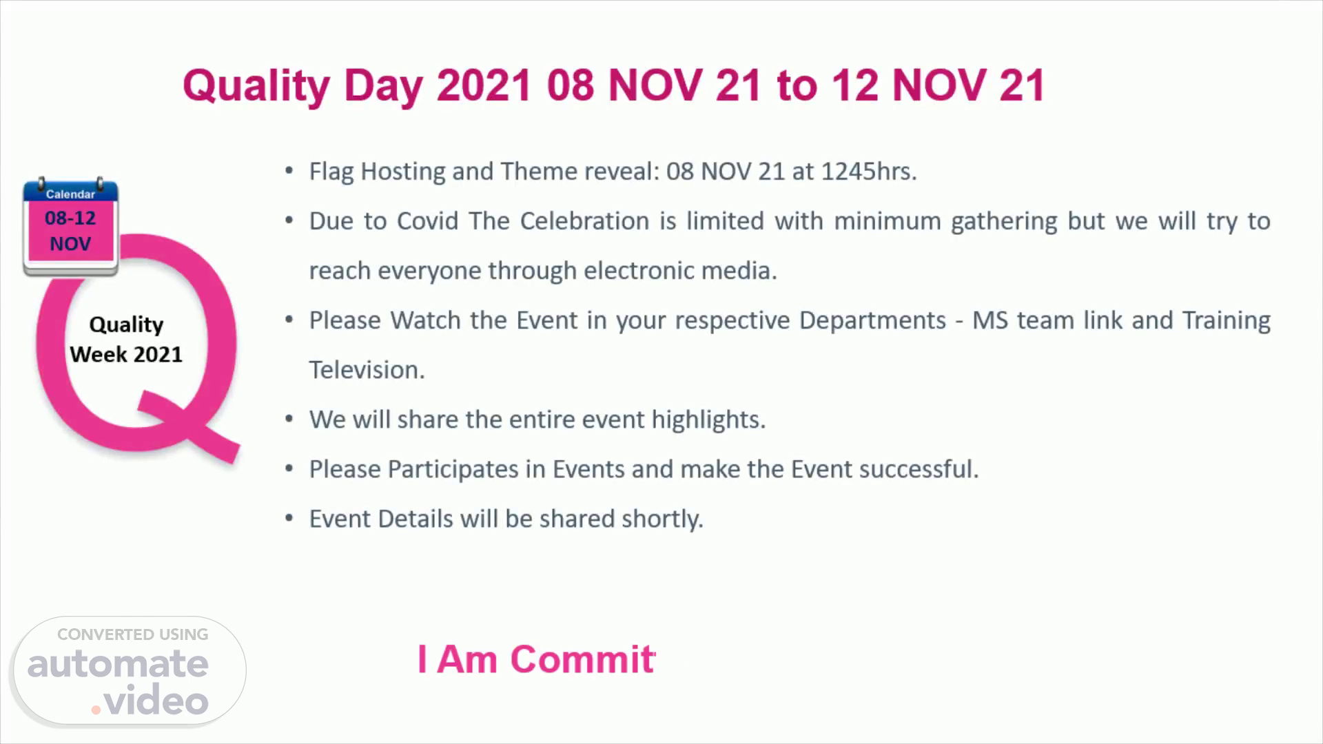 . Quality Day 2021 08 NOV 21 to 12 NOV 21. Flag Hosting and Theme reveal: 08 NOV 21 at 1245hrs. Due to Covid The Celebration is limited with minimum gathering but we will try to reach everyone through electronic media. Please Watch the Event in your respective Departments - MS team link and Training Television. We will share the entire event highlights. Please Participates in Events and make the Event successful. Event Details will be shared shortly..