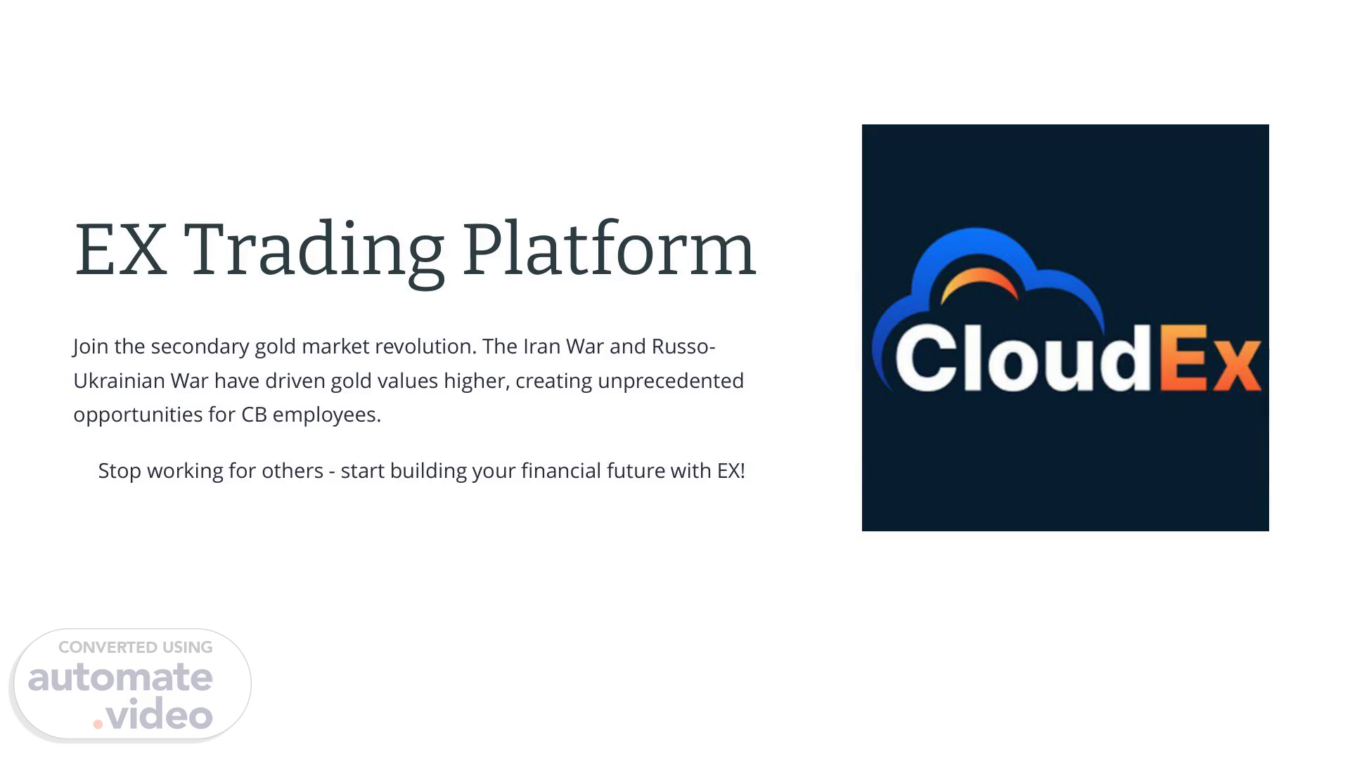[Audio] Welcome to our training video on the EX Trading Platform. During this video, we will discuss the various opportunities available for employees to join the gold market revolution and secure their financial future. Our platform, EX Trading, is at the forefront of encouraging employees to take advantage of the increased value of gold due to ongoing wars in Iran and Ukraine. These wars have led to a rise in gold values, creating unprecedented opportunities for CB employees. This is a chance to move away from relying on a single source of income and take control of your financial future by investing in the secondary gold market. Joining the gold market revolution with EX Trading Platform has many benefits. The increased gold values offer a unique opportunity for significant returns on your investments, which should not be overlooked. Instead of working for others, why not start building your financial future with EX? This is your opportunity to secure a better future for yourself and your loved ones by taking control of your financial well-being. Join us on the EX Trading Platform and be a part of this revolutionary movement. Don't miss the chance to make smart financial decisions and secure your future. Thank you for choosing EX Trading Platform and we look forward to having you on board in the gold market revolution. Thank you for watching and we wish you a successful and prosperous journey with us..