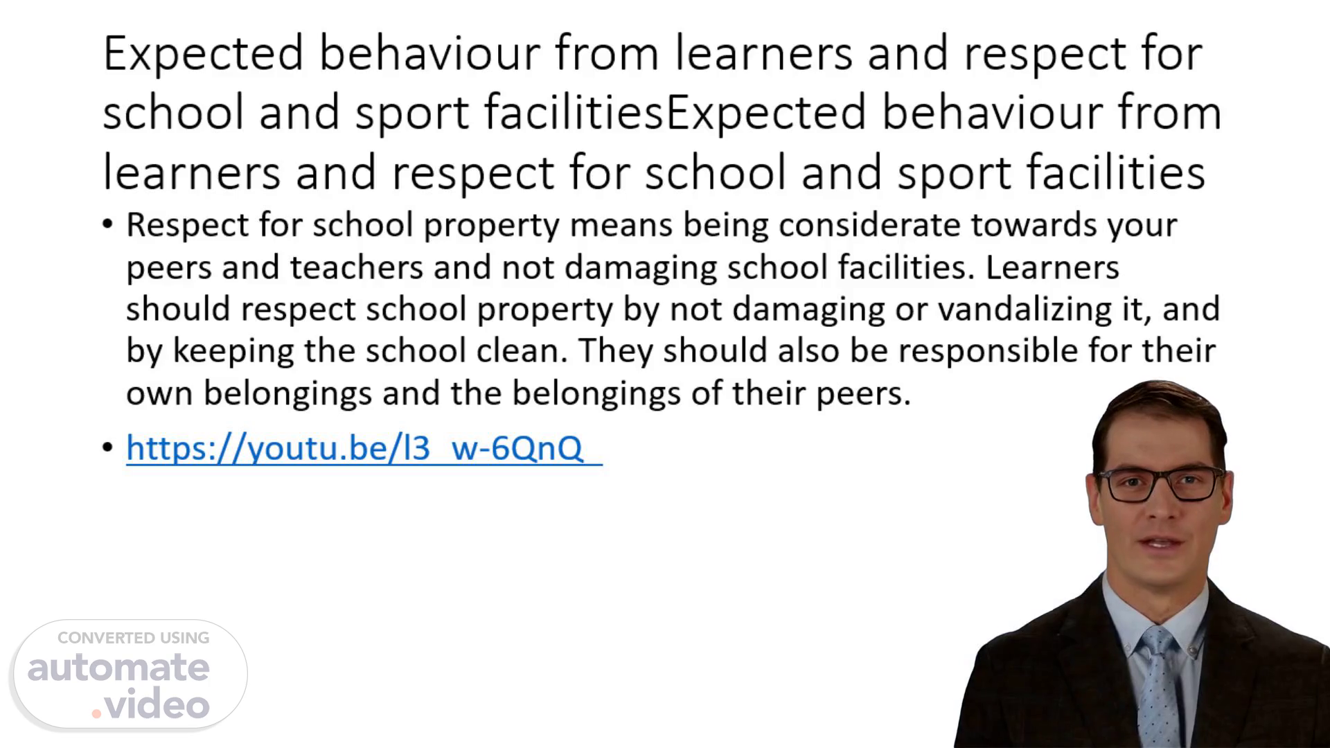 [Virtual Presenter] Learners should show respect for school property by being considerate towards their peers and teachers. This means not damaging or vandalizing school facilities, and keeping the school clean. They should also be responsible for their own belongings and those of their peers. By doing so, we can maintain a safe and supportive environment for learning..