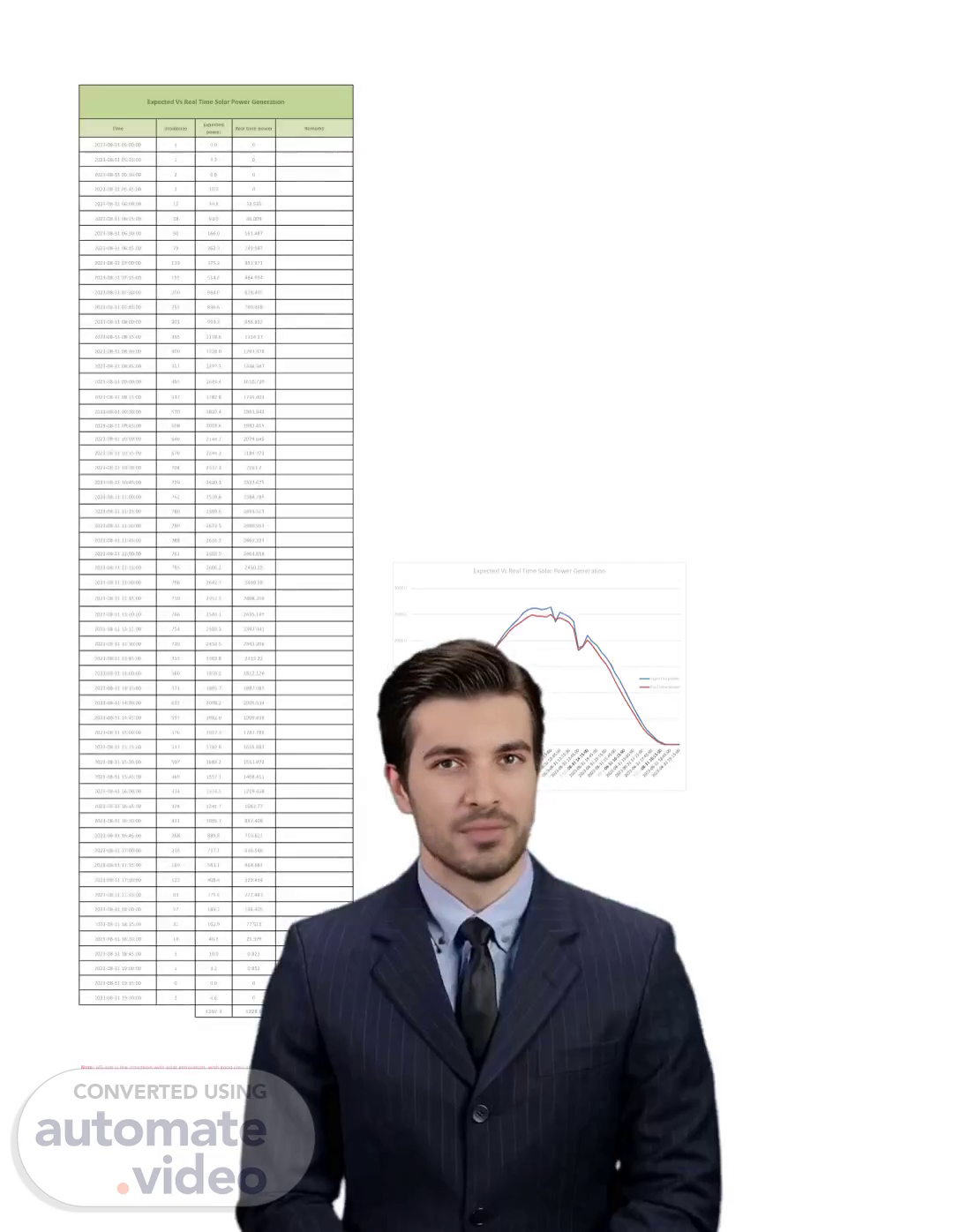 [Virtual Presenter] This data presentation brings together the parameters of solar irradiance and real-time power output over a given period of time. According to the data, there is a 5.28% energy loss and a total of 17,802.4 kWh units were generated with a 6% limitation. This means that we are able to observe the effectiveness of solar energy production and identify areas of improvement..