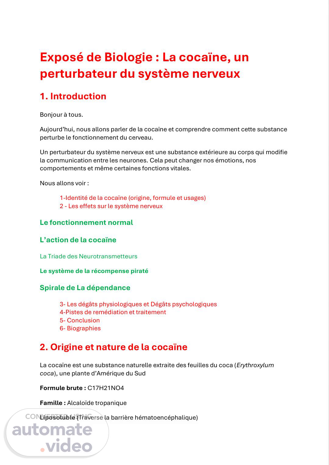 [Audio] Exposé de Biologie : La cocaïne, un perturbateur du système nerveux 1. Introduction Bonjour à tous. Aujourd'hui, nous allons parler de la cocaïne et comprendre comment cette substance perturbe le fonctionnement du cerveau. Un perturbateur du système nerveux est une substance extérieure au corps qui modifie la communication entre les neurones. Cela peut changer nos émotions, nos comportements et même certaines fonctions vitales. Nous allons voir : 1-Identité de la cocaïne (origine, formule et usages) 2 - Les effets sur le système nerveux Le fonctionnement normal L'action de la cocaïne La Triade des Neurotransmetteurs Le système de la récompense piraté Spirale de La dépendance 3- Les dégâts physiologiques et Dégâts psychologiques 4-Pistes de remédiation et traitement 5- Conclusion 6- Biographies 2. Origine et nature de la cocaïne La cocaïne est une substance naturelle extraite des feuilles du coca (Erythroxylum coca), une plante d'Amérique du Sud Formule brute : C17H21NO4 Famille : Alcaloïde tropanique Liposoluble (Traverse la barrière hématoencéphalique).