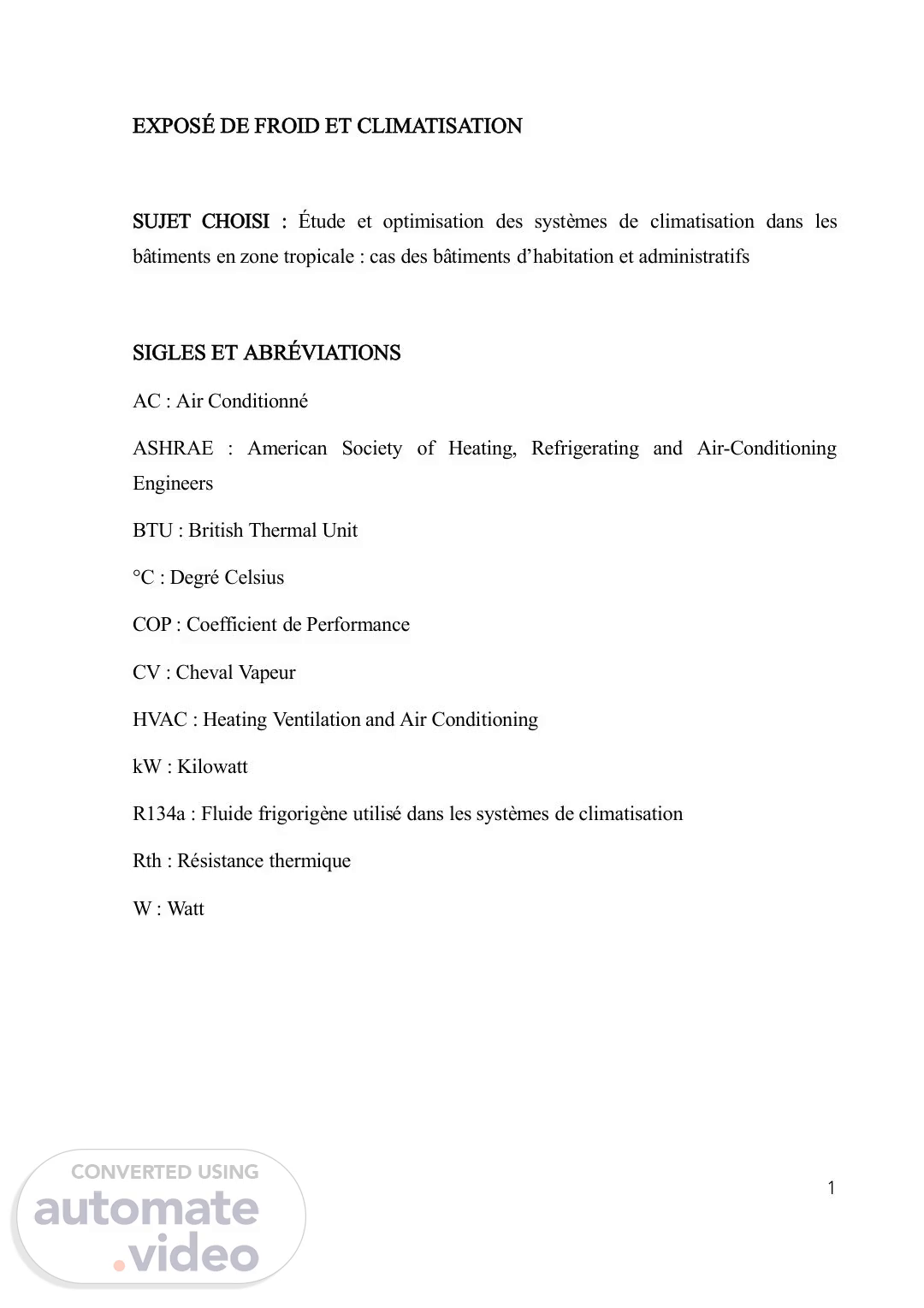 [Audio] EXPOSÉ DE FROID ET CLIMATISATION SUJET CHOISI : Étude et optimisation des systèmes de climatisation dans les bâtiments en zone tropicale : cas des bâtiments d'habitation et administratifs SIGLES ET ABRÉVIATIONS AC : Air Conditionné ASHRAE : American Society of Heating, Refrigerating and Air-Conditioning Engineers BTU : British Thermal Unit °C : Degré Celsius COP : Coefficient de Performance CV : Cheval Vapeur HVAC : Heating Ventilation and Air Conditioning kW : Kilowatt R134a : Fluide frigorigène utilisé dans les systèmes de climatisation Rth : Résistance thermique W : Watt 1.