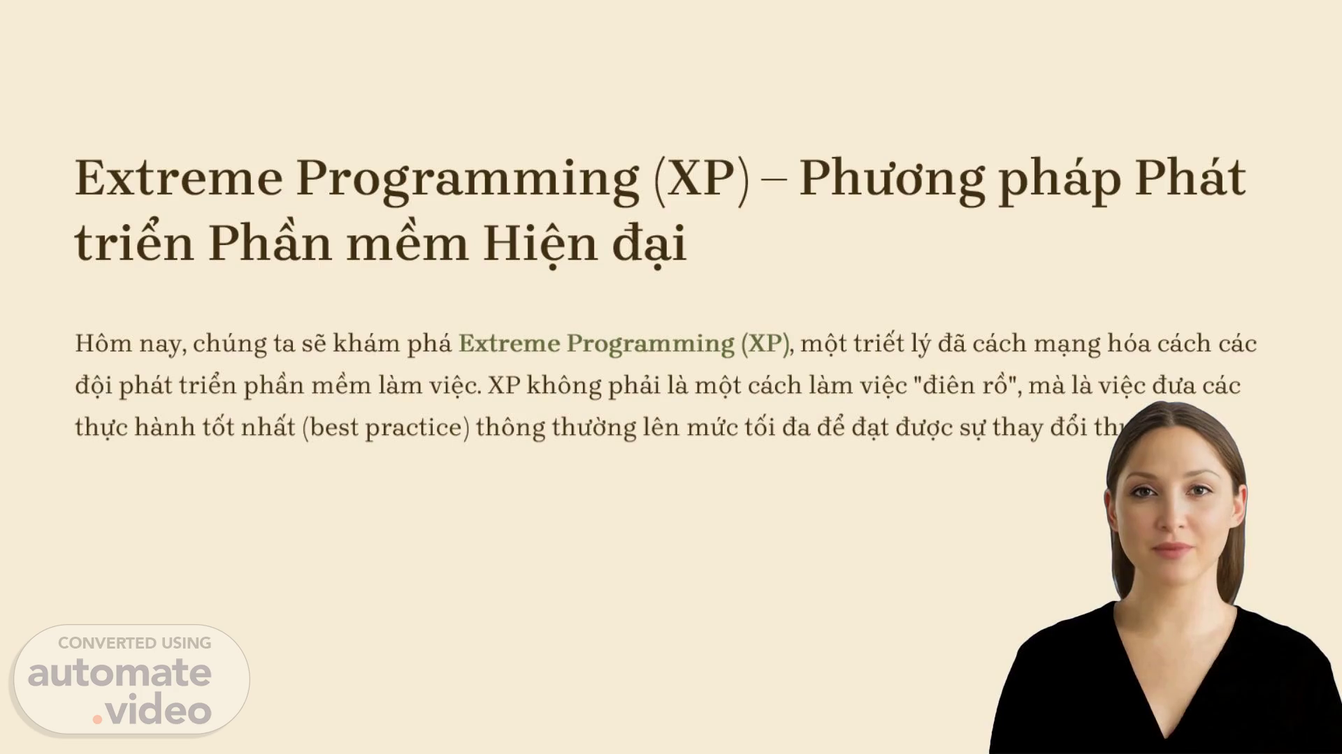 [Virtual Presenter] "Chào mừng bạn đến với bức tranh tổng quan về Phương pháp Phát triển Phần mềm Hiện đại, còn được biết đến với tên gọi Extreme Programming (XP). Hôm nay, chúng ta sẽ cùng tìm hiểu về triết lý này đã thay đổi cách các đội phát triển phần mềm làm việc. XP không phải là một cách làm việc "điên rồ", mà là việc đưa các thực hành tốt nhất lên mức tối đa để đạt được sự thay đổi thực sự. Đây là một khung công tác linh hoạt và phù hợp với phương pháp Agile, được tạo ra bởi Kent Beck và đồng đội vào cuối những năm 1990. Mục tiêu chính của XP là đạt được phần mềm chất lượng cao, chi phí thấp và đội ngũ hạnh phúc thông qua việc cung cấp phản hồi nhanh và duy trì sự đơn giản liên tục trong quá trình phát triển. Đã được giới thiệu về Extreme Programming và các thông tin cơ bản liên quan đến nó. Hãy khám phá các khía cạnh khác của XP trong các slide tiếp theo. Chúng tôi tin rằng bạn sẽ tìm thấy những thông tin hữu ích và áp dụng được trong công việc của mình..