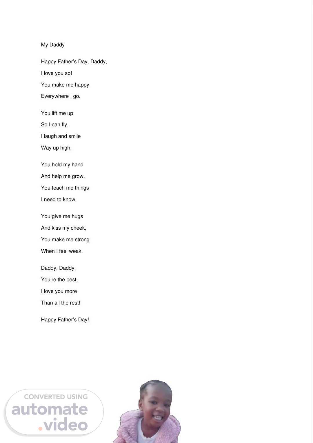 My Daddy Happy Father’s Day, Daddy, I love you so! You make me happy Everywhere I go. You lift me up So I can fly, I laugh and smile Way up high. You hold my hand And help me grow, You teach me things I need to know. You give me hugs And kiss my cheek, You make me strong When I feel weak. Daddy, Daddy, You’re the best, I love you more Than all the rest! Happy Father’s Day!.