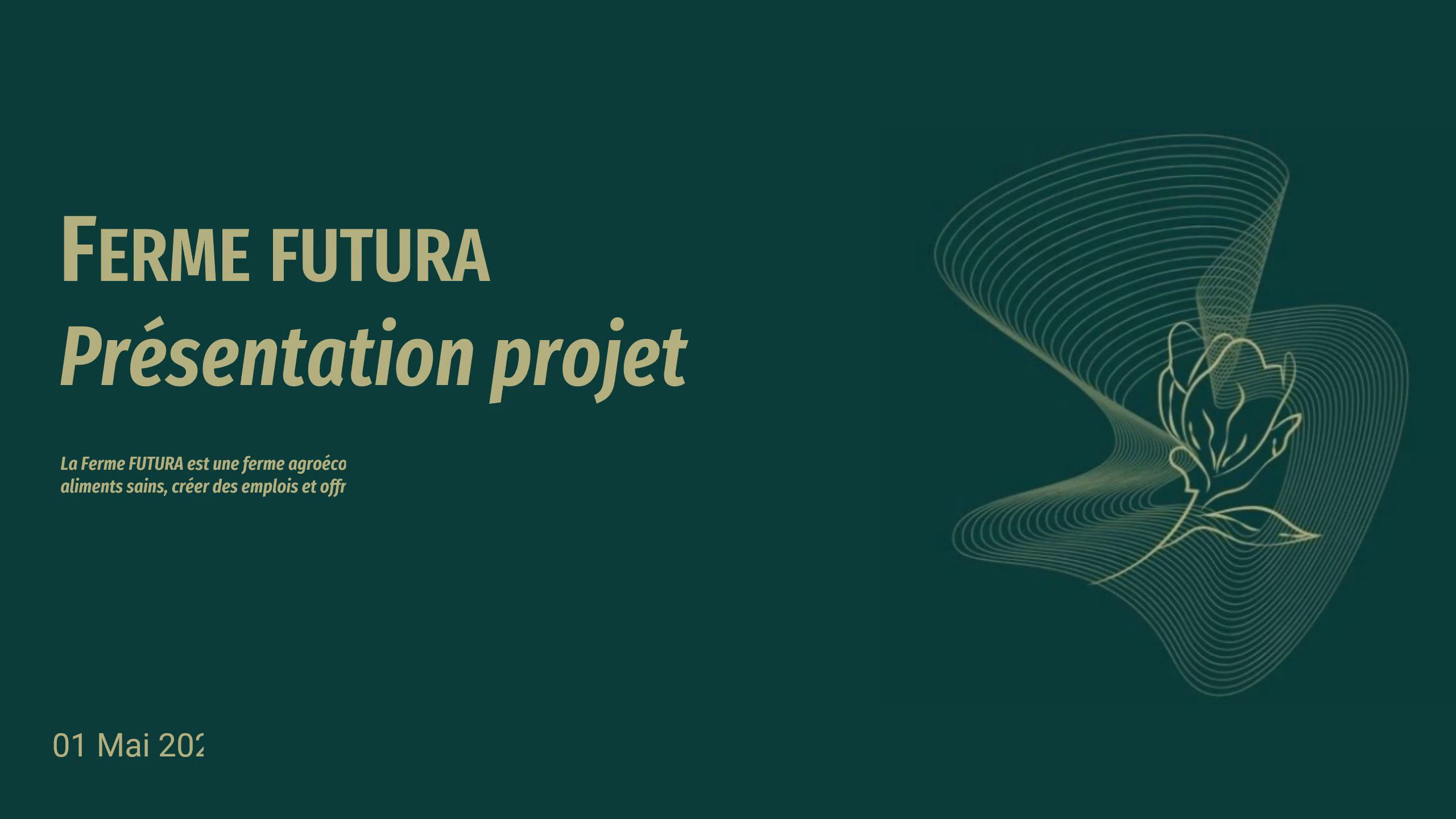 Ferme futura Présentation projet. 01 Mai 2025. La Ferme FUTURA est une ferme agroécologique utilisant des technologies avancées pour produire des aliments sains, créer des emplois et offrir des formations..