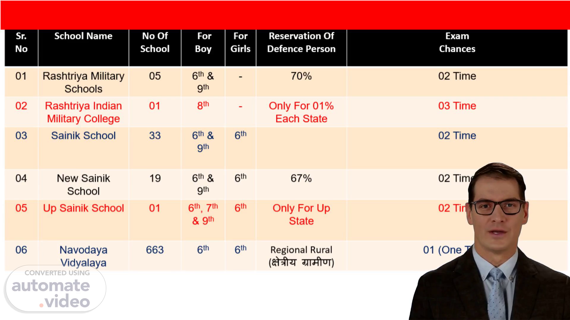 [Virtual Presenter] The Rashtriya Military Schools offer five schools, providing education from the 6th and 9th standards. Boys and girls are both eligible to attend these schools. A significant percentage of seats are reserved for defense personnel, specifically 70%. Additionally, students have opportunities to take exams and pursue further education..