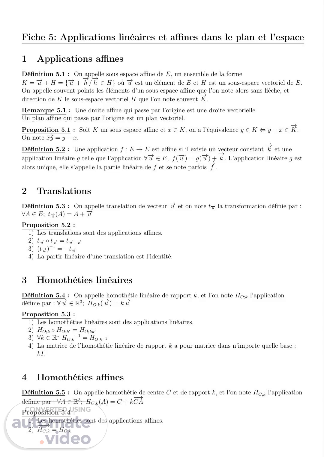 Fiche 5: Applications linéaires et affines dans le plan et l’espace 1 Applications affines Définition 5.1 : On appelle sous espace affine de E, un ensemble de la forme K = −→u + H = où −→u est un élément de E et H est un sous-espace vectoriel de E. On appelle souvent points les éléments d’un sous espace affine que l’on note alors sans flèche, et direction de K le sous-espace vectoriel H que l’on note souvent −→ K. Remarque 5.1 : Une droite affine qui passe par l’origine est une droite vectorielle. Un plan affine qui passe par l’origine est un plan vectoriel. Proposition 5.1 : Soit K un sous espace affine et x ∈ K, on a l’équivalence y ∈ K ⇔ y − x ∈ −→ K. On note −→ xy = y − x. Définition 5.2 : Une application f : E → E est affine si il existe un vecteur constant −→k et une application linéaire g telle que l’application ∀−→u ∈ E, f(−→u ) = g(−→u ) + −→k . L’application linéaire g est alors unique, elle s’appelle la partie linéaire de f et se note parfois −→f . 2 Translations Définition 5.3 : On appelle translation de vecteur −→u et on note t− → u la transformation définie par : ∀A ∈ E; t− → u (A) = A + −→u Proposition 5.2 : 1) Les translations sont des applications affines. 2) t− → u ◦ t− → v = t− → u +− → v 3) (t− → u )−1 = −t− → u 4) La partir linéaire d’une translation est l’identité. 3 Homothéties linéaires Définition 5.4 : On appelle homothétie linéaire de rapport k, et l’on note HO;k l’application définie par : ∀−→u ∈ R3; HO;k(−→u ) = k−→u Proposition 5.3 : 1) Les homothéties linéaires sont des applications linéaires. 2) HO;k ◦ HO;k′ = HO;kk′ 3) ∀k ∈ R∗ HO;k −1 = HO;k−1 4) La matrice de l’homothétie linéaire de rapport k a pour matrice dans n’importe quelle base : kI. 4 Homothéties affines Définition 5.5 : On appelle homothétie de centre C et de rapport k, et l’on note HC;k l’application définie par : ∀A ∈ R3; HC;k(A) = C + k−→ CA Proposition 5.4 : 1) Les homothéties sont des applications affines. 2) −−→ HC;k = HO;k.