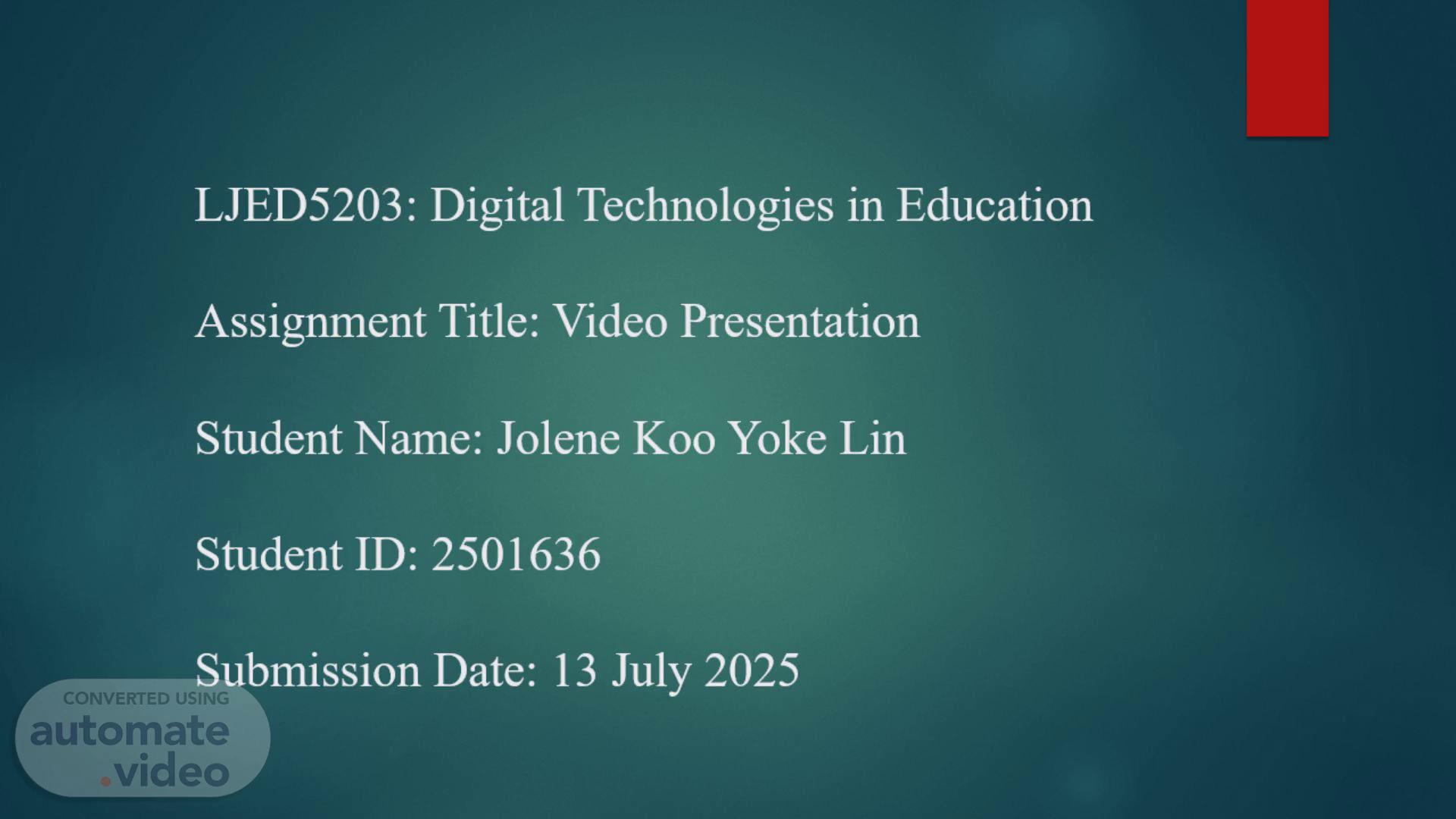 LJED5203: Digital Technologies in Education Assignment Title: Video Presentation Student Name: Jolene Koo Yoke Lin Student ID: 2501636 Submission Date: 13 July 2025.