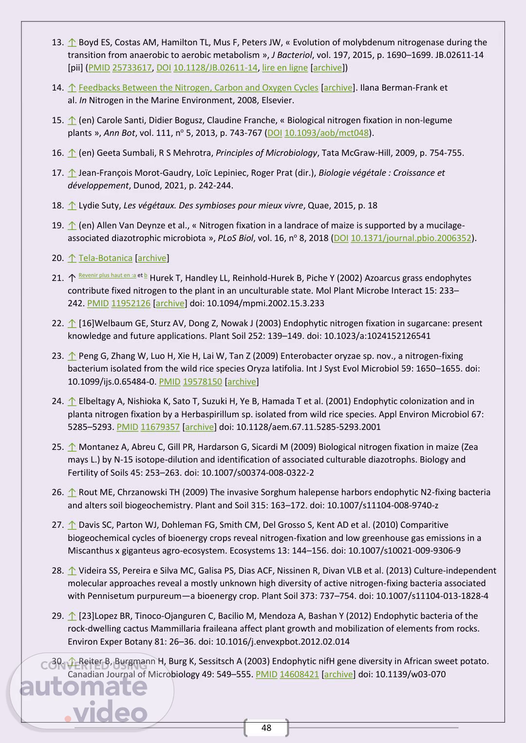 49 31. ↑ Terakado-Tonooka J, Fujihara S, Ohwaki Y (2012) Possible contribution of Bradyrhizobium on nitrogen fixation in sweet potatoes. Plant and Soil 367: 639–650. doi: 10.1007/s11104-012-1495-x 32. ↑ DeLuca TH, Zackrisson O, Gundale MJ, Nilsson MC (2008) Ecosystem feedbacks and nitrogen fixation in boreal forests. Science 320: 1181. 320/5880/1181 [pii]; doi: 10.1126/science.1154836. PMID 18511682 [archive] 33. ↑ Dalton DA, Kramer S, Azios N, Fusaro S, Cahill E, Kennedy C (2004) Endophytic nitrogen fixation in dune grasses (Ammophila arenaria and Elymus mollis) from Oregon. FEMS Microbiol Ecol 49: 469–479. doi: 10.1016/j.femsec.2004.04.010. PMID 19712295 [archive] 34. ↑ Jimenez-Salgado T, Fuentes-Ramirez LE, Tapia-Hernandez A, Mascarua-Esparza MA, Martinez-Romero E, Caballero-Mellado J (1997) Coffea arabica L., a new host plant for Acetobacter diazotrophicus, and isolation of other nitrogen-fixing acetobacteria. Applied and Environmental Microbiology 63: 3676– 3683. PMID 9293018 [archive] 35. ↑ Bal A, Chanway CP (2012) Evidence of nitrogen fixation in lodgepole pine inoculated with diazotrophic Paenibacillus polymyxa. Botany 90: 891–896. doi: 10.1139/b2012-044 36. ↑ Carrell AA, Frank AC (2014) Pinus flexilis and Picea engelmannii share a simple and consistent needle endophyte microbiota with a potential role in nitrogen fixation. Front Microbiol 5: 333. doi: 10.3389/fmicb.2014.00333. PMID 25071746 [archive] 37. ↑ Iniguez AL, Dong Y, Triplett EW (2004) Nitrogen fixation in wheat provided by Klebsiella pneumoniae 342. Mol Plant Microbe Interact 17: 1078–1085. PMID 15497400 [archive] doi: 10.1094/mpmi.2004.17.10.1078 38. ↑ Elbeltagy A, Nishioka K, Sato T, Suzuki H, Ye B, Hamada T et al. (2001) Endophytic colonization and in planta nitrogen fixation by a Herbaspirillum sp. isolated from wild rice species. Appl Environ Microbiol 67: 5285–5293. PMID 11679357 [archive] doi: 10.1128/aem.67.11.5285-5293.2001 39. ↑ Sevilla M, Burris RH, Gunapala N, Kennedy C (2001) Comparison of benefit to sugarcane plant growth and 15N2 incorporation following inoculation of sterile plants with Acetobacter diazotrophicus wild-type and Nif- mutant strains. Molecular Plant Microbe Interactions 14: 358–366. PMID 11277433 [archive] doi: 10.1094/mpmi.2001.14.3.358 40. ↑ Pinto-Tomas AA, Anderson MA, Suen G, Stevenson DM, Chu FS, Cleland WW et al. (2009) Symbiotic nitrogen fixation in the fungus gardens of leaf-cutter ants. Science 326: 1120–1123. 326/5956/1120 [pii]; doi: 10.1126/science.1173036. PMID 19965433 [archive] 41. ↑ Revenir plus haut en :a et b Doty SL, Sher AW, Fleck ND, Khorasani M, Bumgarner RE, Khan Z, et al. (2016) Variable Nitrogen Fixation in Wild Populus [archive]. PLoS ONE 11(5): e0155979. doi:10.1371/journal.pone.0155979, licence creative commons CC-BY-SA 4.0 [archive] 42. ↑ Schollhorn R, Burris RH (1967) Acetylene as a competitive inhibitor of N-2 fixation. Proc Natl Acad Sci U S A 58: 213–216. PMID 5231601 [archive] doi: 10.1073/pnas.58.1.213 Article (Nitrification) 1. ↑ Yvon R. Dommergues et François Mangenot, Écologie microbienne du sol, Masson et Cie, 1970, p. 198. 2. ↑ (en) Robert K. Poole, Advances in microbial physiology, Academic Press, 2016, p. 16. 3. ↑ Robert Barbault, Écologie générale : Structure et fonctionnement de la biosphère, 5e édition, Dunod, p. 32 Article Assimilation de l'azote 1. ↑ Deroche, Marie-Esther, « Relations entre la photosynthèse et l'assimilation de l'azote », Bulletin de la Société Botanique de France. Actualités Botaniques, 1983, p. 85 - 98 (ISSN 0181-1789, lire en ligne [archive]).