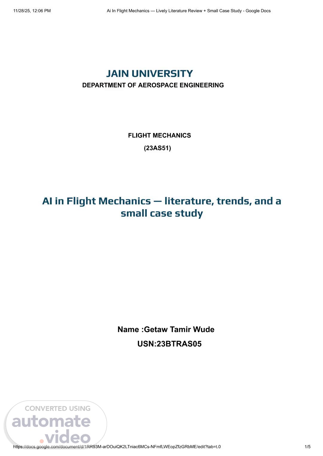 JAIN UNIVERSITY DEPARTMENT OF AEROSPACE ENGINEERING FLIGHT MECHANICS (23AS51) A1 in Flight Mechanics — literature, trends, and a small case study Name :Getaw Tamir Wude USN:23BTRAS05.