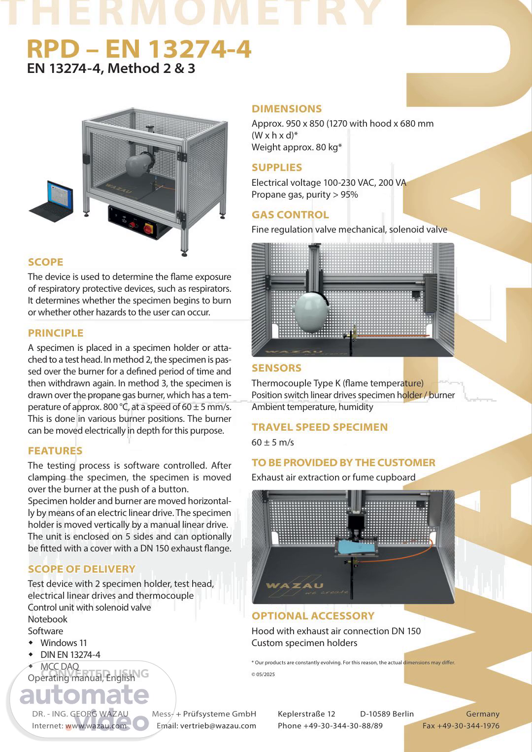THERMOMETRY SCOPE SCOPE The device is used to determine the flame exposure of respiratory protective devices, such as respirators. It determines whether the specimen begins to burn or whether other hazards to the user can occur. PRINCIPLE PRINCIPLE A specimen is placed in a specimen holder or atta- ched to a test head. In method 2, the specimen is pas- sed over the burner for a defined period of time and then withdrawn again. In method 3, the specimen is drawn over the propane gas burner, which has a tem- perature of approx. 800 °C, at a speed of 60 ± 5 mm/s. This is done in various burner positions. The burner can be moved electrically in depth for this purpose. FEATURES FEATURES The testing process is software controlled. After clamping the specimen, the specimen is moved over the burner at the push of a button. Specimen holder and burner are moved horizontal- ly by means of an electric linear drive. The specimen holder is moved vertically by a manual linear drive. The unit is enclosed on 5 sides and can optionally be fitted with a cover with a DN 150 exhaust flange. SCOPE OF DELIVERY SCOPE OF DELIVERY Test device with 2 specimen holder, test head, electrical linear drives and thermocouple Control unit with solenoid valve Notebook Software � Windows 11 � DIN EN 13274-4 � MCC DAQ Operating manual, English DIMENSIONS DIMENSIONS Approx. 950 x 850 (1270 with hood x 680 mm (W x h x d)* Weight approx. 80 kg* SUPPLIES SUPPLIES Electrical voltage 100-230 VAC, 200 VA Propane gas, purity > 95% GAS CONTROL GAS CONTROL Fine regulation valve mechanical, solenoid valve SENSORS SENSORS Thermocouple Type K (flame temperature) Position switch linear drives specimen holder / burner Ambient temperature, humidity TRAVEL SPEED SPECIMEN TRAVEL SPEED SPECIMEN 60 ± 5 m/s TO BE PROVIDED BY THE CUSTOMER TO BE PROVIDED BY THE CUSTOMER Exhaust air extraction or fume cupboard OPTIONAL ACCESSORY OPTIONAL ACCESSORY Hood with exhaust air connection DN 150 Custom specimen holders * Our products are constantly evolving. For this reason, the actual dimensions may differ. © 05/2025 EN 13274-4, Method 2 & 3 RPD – EN 13274-4 DR. - ING. GEORG WAZAU Mess- + Prüfsysteme GmbH Keplerstraße 12 D-10589 Berlin Germany Internet: www.wazau.com Email: [email protected] Phone +49-30-344-30-88/89 Fax +49-30-344-1976.