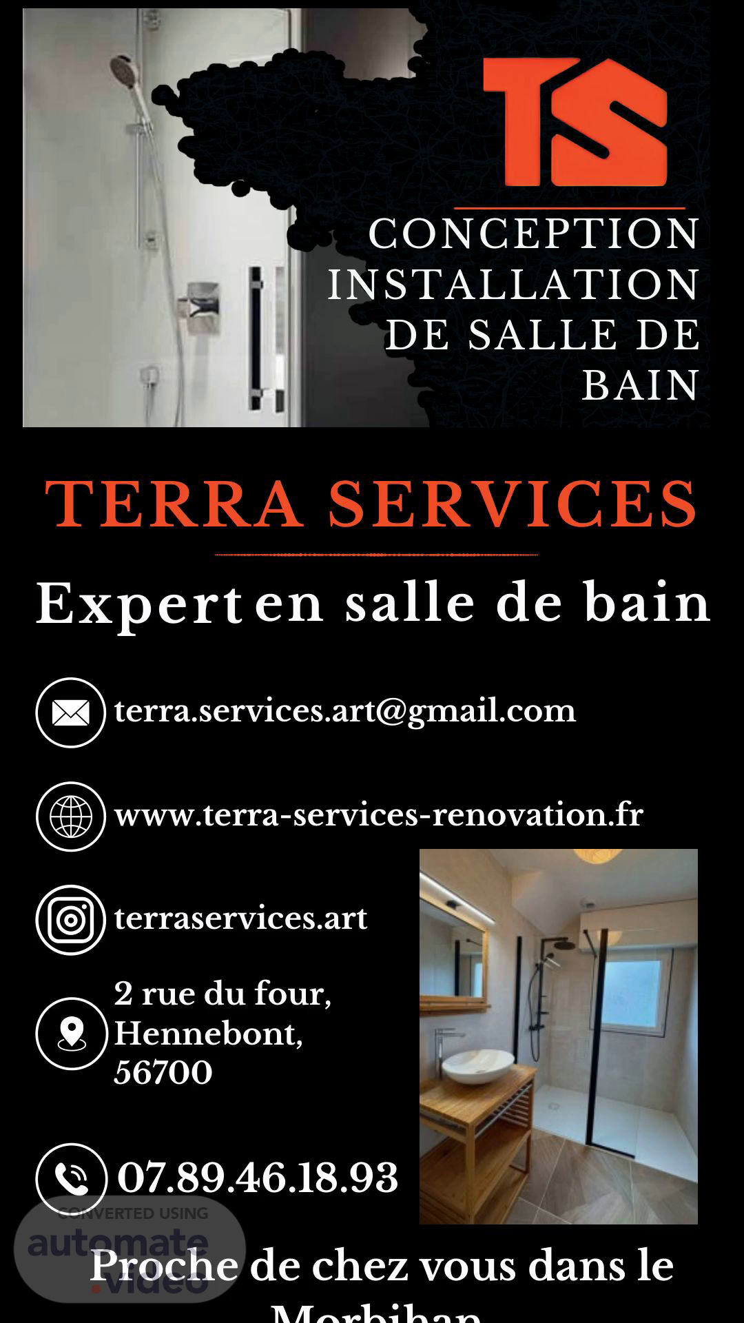 TERRA SERVICES 2 rue du four, Hennebont, 56700 07.89.46.18.93 [email protected] www.terra-services-renovation.fr terraservices.art CONCEPTION INSTALLATION DE SALLE DE BAIN en salle de bain Expert Profitez de - 10% sur vos travaux de salle de bain Offre valable pour tout devis signé entre le 1er septembre et le 31 décembre 2025 Proche de chez vous dans le Morbihan.