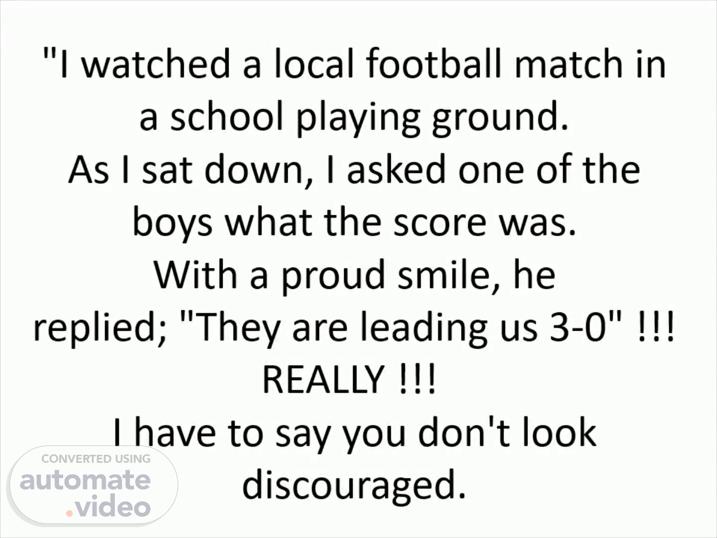 "I watched a local football match in a school playing ground. As I sat down, I asked one of the boys what the score was. With a proud smile, he replied; "They are leading us 3-0" !!! REALLY !!! I have to say you don't look discouraged.