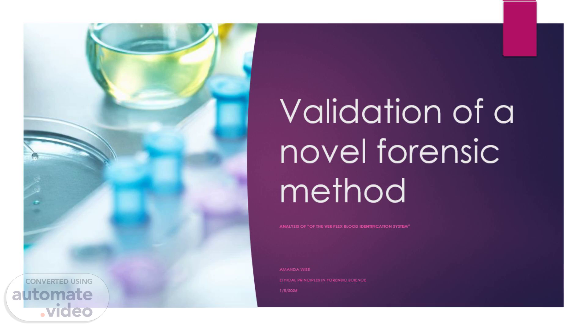 [Audio] Validation of a novel forensic method Analysis of “of the Ver plex blood identification System” Amanda wise Ethical principles in forensic science 1/8/2026 "Good morning. Today, I will walk you through a critical review of a published validation study for a new forensic instrument. We will cover the importance of validation, examine a specific case study, analyze the tests performed, and evaluate the thoroughness of the study.".