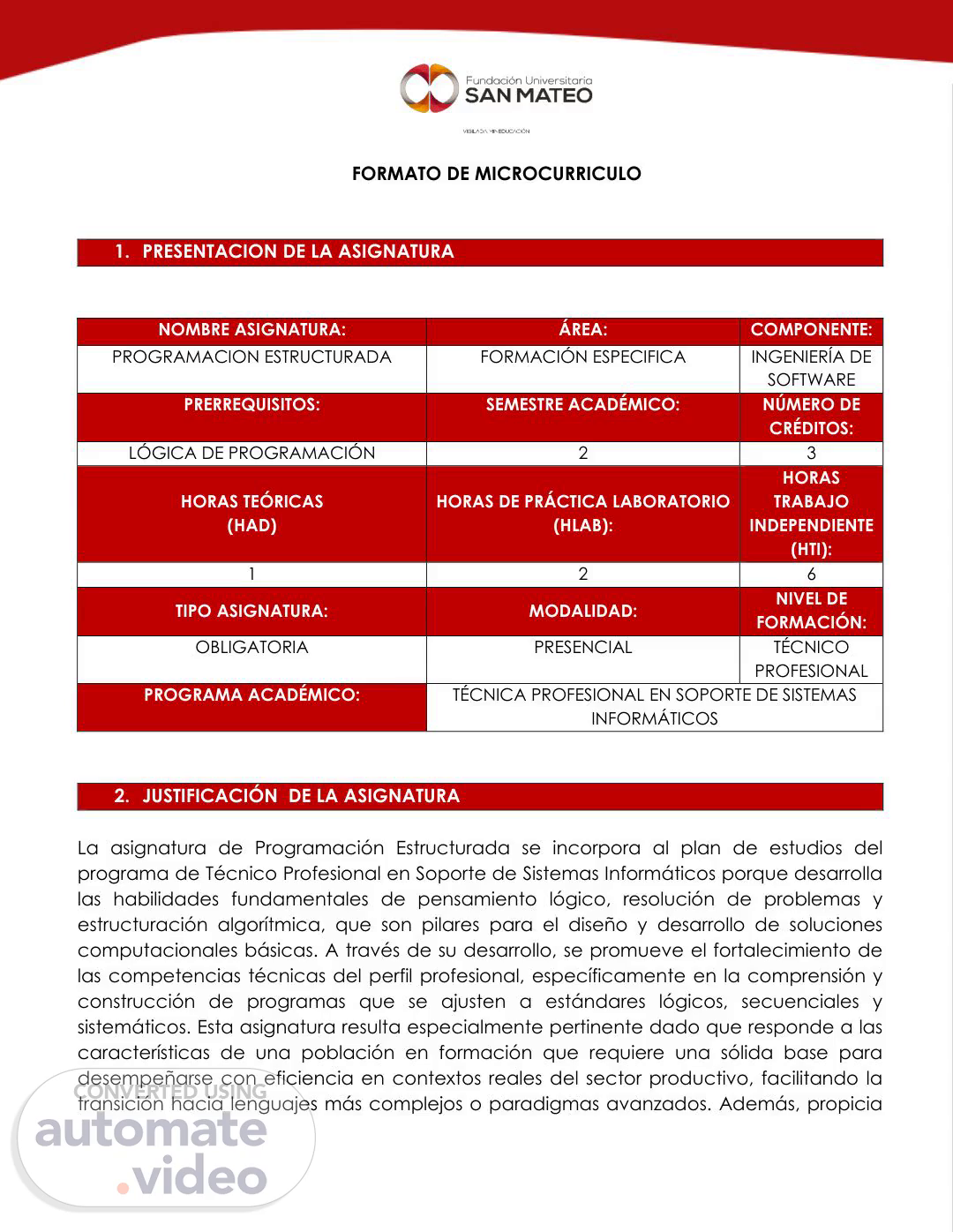 [Audio] FORMATO DE MICROCURRICULO 1. PRESENTACION DE LA ASIGNATURA NOMBRE ASIGNATURA: ÁREA: COMPONENTE: PROGRAMACION ESTRUCTURADA FORMACIÓN ESPECIFICA INGENIERÍA DE SOFTWARE PRERREQUISITOS: SEMESTRE ACADÉMICO: NÚMERO DE CRÉDITOS: LÓGICA DE PROGRAMACIÓN 2 3 HORAS HORAS TEÓRICAS HORAS DE PRÁCTICA LABORATORIO TRABAJO (HAD) (HLAB): INDEPENDIENTE (HTI): 1 2 6 TIPO ASIGNATURA: MODALIDAD: NIVEL DE FORMACIÓN: OBLIGATORIA PRESENCIAL TÉCNICO PROFESIONAL PROGRAMA ACADÉMICO: TÉCNICA PROFESIONAL EN SOPORTE DE SISTEMAS INFORMÁTICOS 2. JUSTIFICACIÓN DE LA ASIGNATURA La asignatura de Programación Estructurada se incorpora al plan de estudios del programa de Técnico Profesional en Soporte de Sistemas Informáticos porque desarrolla las habilidades fundamentales de pensamiento lógico, resolución de problemas y estructuración algorítmica, que son pilares para el diseño y desarrollo de soluciones computacionales básicas. A través de su desarrollo, se promueve el fortalecimiento de las competencias técnicas del perfil profesional, específicamente en la comprensión y construcción de programas que se ajusten a estándares lógicos, secuenciales y sistemáticos. Esta asignatura resulta especialmente pertinente dado que responde a las características de una población en formación que requiere una sólida base para desempeñarse con eficiencia en contextos reales del sector productivo, facilitando la transición hacia lenguajes más complejos o paradigmas avanzados. Además, propicia.