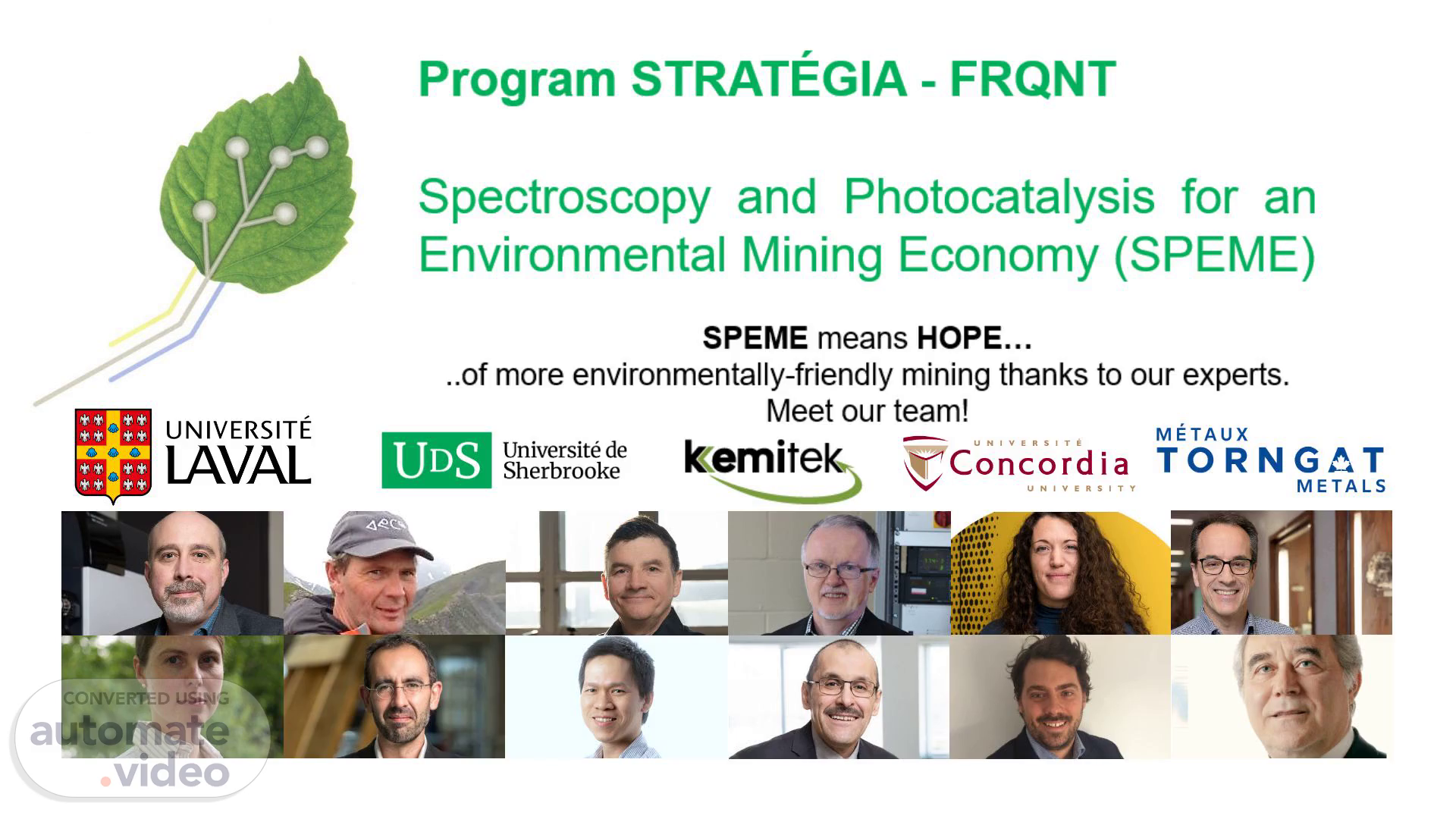 [Audio] Welcome this introduction to our project SPEME, funded under the program STRATEGIA of the FRQNT, that reunite college, university, and industrial partners in Quebec, with the common goal to create a network of experts to improve the mining environmental footprint..