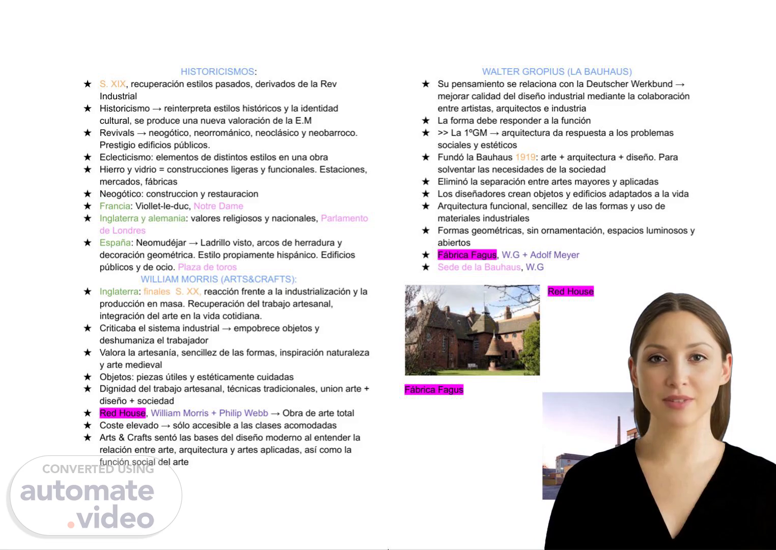 [Virtual Presenter] La Bauhaus fue una escuela de arte y diseño fundada por Walter Gropius en 1919. El objetivo principal de la escuela era fusionar el arte y la arquitectura para crear objetos y edificios más funcionales y sencillos. Gropius estaba interesado en el historicismo, que es el estudio de los estilos y la identidad cultural de diferentes épocas..