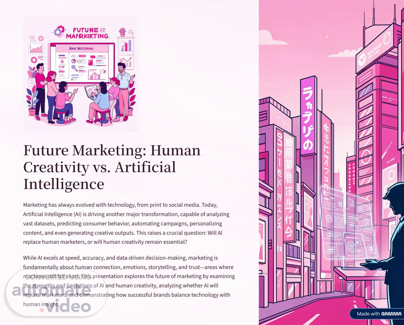 Future Marketing: Human Creativity vs. Artificial Intelligence Marketing has always evolved with technology, from print to social media. Today, Artificial Intelligence (AI) is driving another major transformation, capable of analyzing vast datasets, predicting consumer behavior, automating campaigns, personalizing content, and even generating creative outputs. This raises a crucial question: Will AI replace human marketers, or will human creativity remain essential? While AI excels at speed, accuracy, and data-driven decision-making, marketing is fundamentally about human connection, emotions, storytelling, and trust4areas where machines still fall short. This presentation explores the future of marketing by examining the strengths and limitations of AI and human creativity, analyzing whether AI will replace marketers, and demonstrating how successful brands balance technology with human insight..
