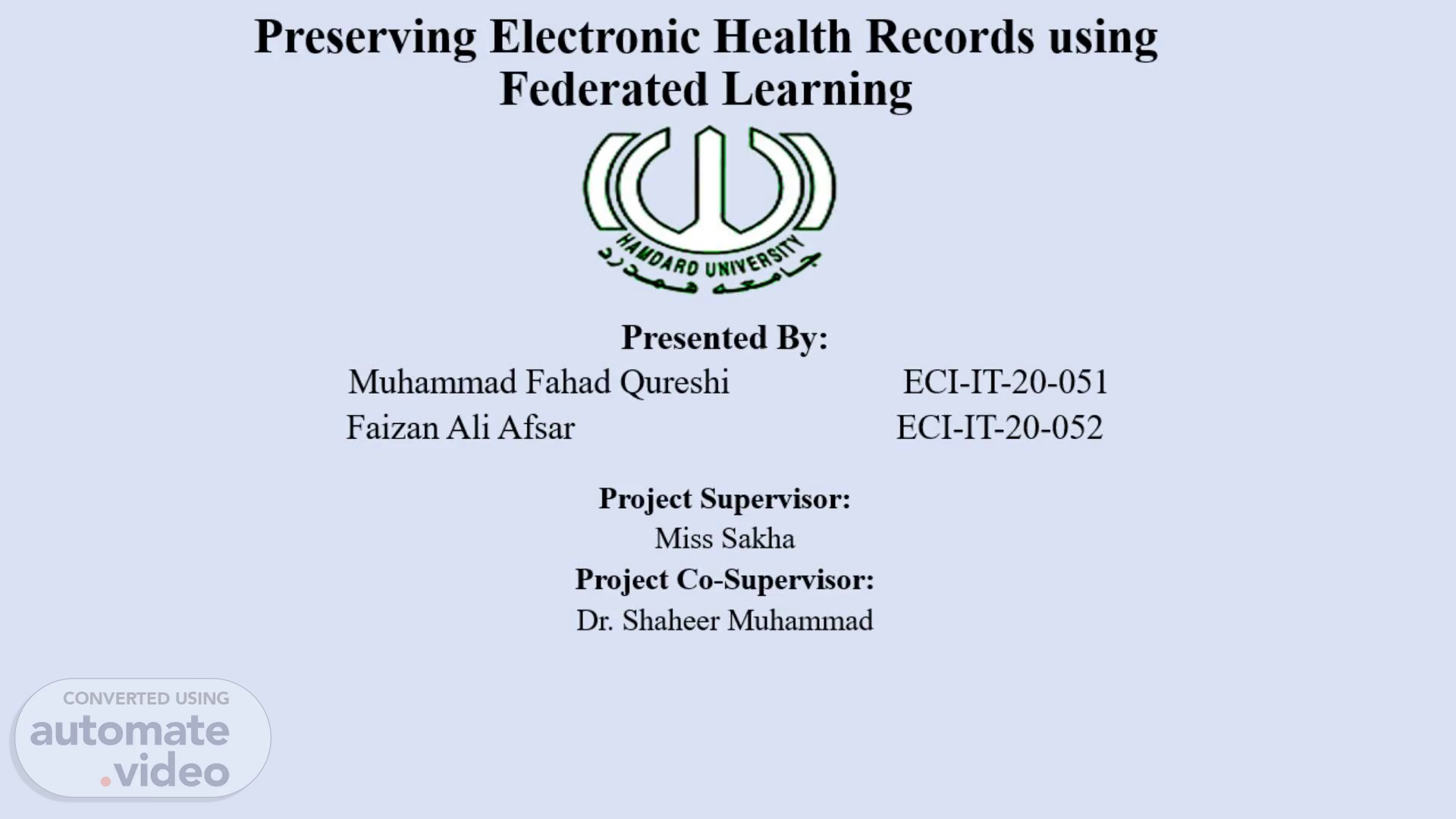 [Audio] Preserving Electronic Health Records using Federated Learning Presented By: Muhammad Fahad Qureshi ECI-IT-20-051 Faizan Ali Afsar ECI-IT-20-052 Project Supervisor: Miss Sakha Project Co-Supervisor: Dr. Shaheer Muhammad Department of Computing Faculty of Engineering Science & Technology Hamdard University Islamabad Campus.