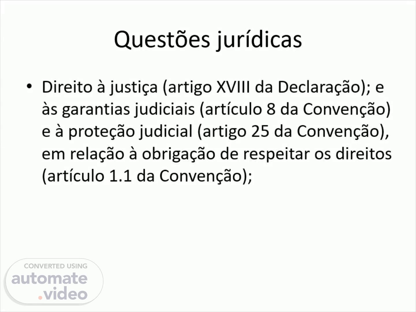 Questões jurídicas. Direito à justiça (artigo XVIII da Declaração); e às garantias judiciais (artículo 8 da Convenção) e à proteção judicial (artigo 25 da Convenção), em relação à obrigação de respeitar os direitos (artículo 1.1 da Convenção);.