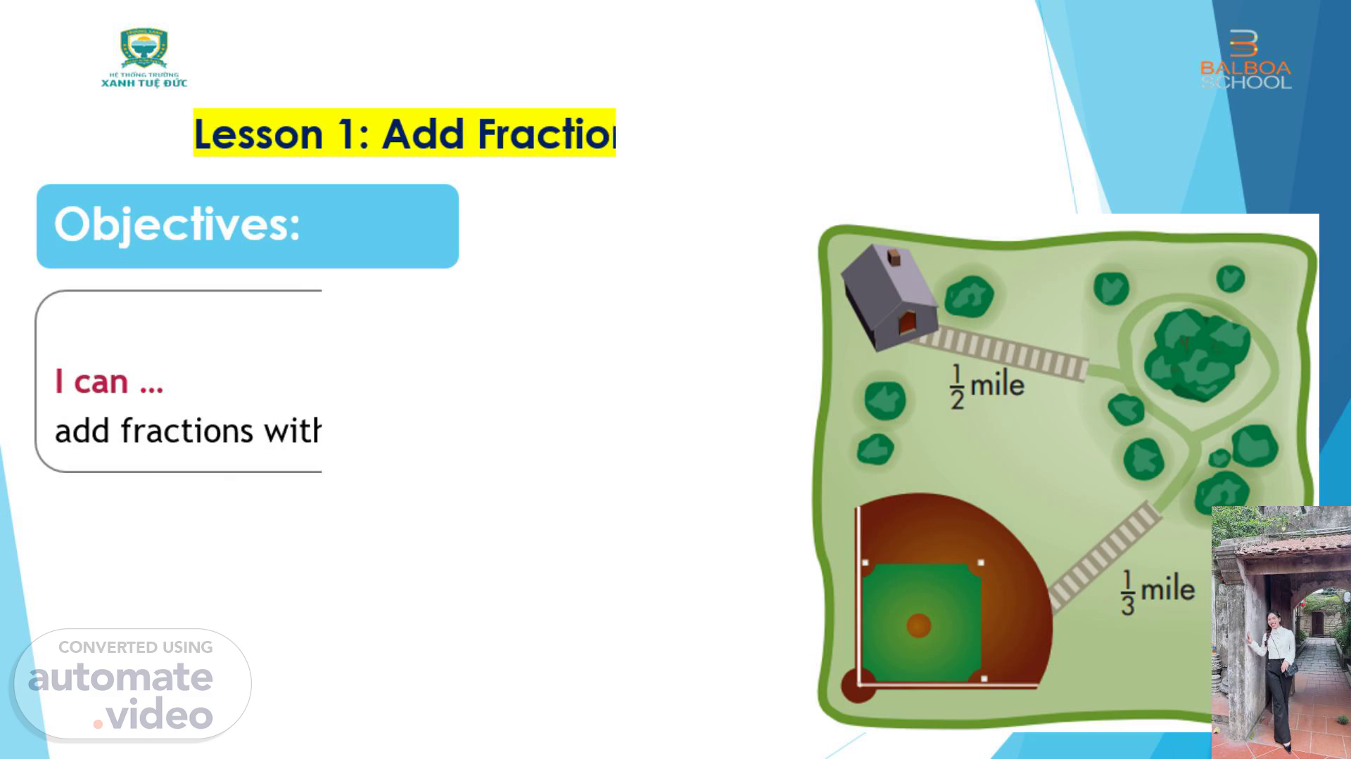 [Audio] The focus of this lesson is adding fractions with unlike denominators. By the end of the lesson, you will have the ability to successfully add fractions with different denominators. Let's consider a real-life scenario- Alex riding his scooter from his house to the park and then to baseball practice. The question is, what is the total distance Alex rode? To solve this problem, we must add the distances of both trips. However, the challenge here is that the fractions have different denominators. No worries, we will teach you how to solve this using a few simple steps. First, we need to find a common denominator- a number that both denominators can evenly divide into. In this case, we can use 10 as our common denominator. Then, we convert both fractions to have a denominator of 10 by using a fraction bar. We multiply the numerator and denominator of the first fraction by 5 and the second fraction by 2. This results in the new fractions of 5/10 and 6/10. We can now add the two fractions together- 5/10 + 6/10 = 11/10. But this is an improper fraction; we must convert it to a mixed number by dividing the numerator by the denominator. The final answer is 1 and 1/10. Congratulations, you have successfully added fractions with unlike denominators! Let's look at another example (insert image). The two fractions, 1/6 and 1/4, have different denominators. Using the same steps, we find the common denominator of 12 and convert both fractions to have a denominator of 12. This results in the new fractions of 2/12 and 3/12. Finally, we add the two fractions together- 2/12 + 3/12 = 5/12. So the answer is 5/12. Remember, when adding fractions with different denominators, always find the common denominator, convert the fractions, and then add (insert image). Now, it's your turn to practice adding fractions with unlike denominators using the methods we just learned. You will be able to solve any problem that involves adding fractions with different denominators. Best of luck!.