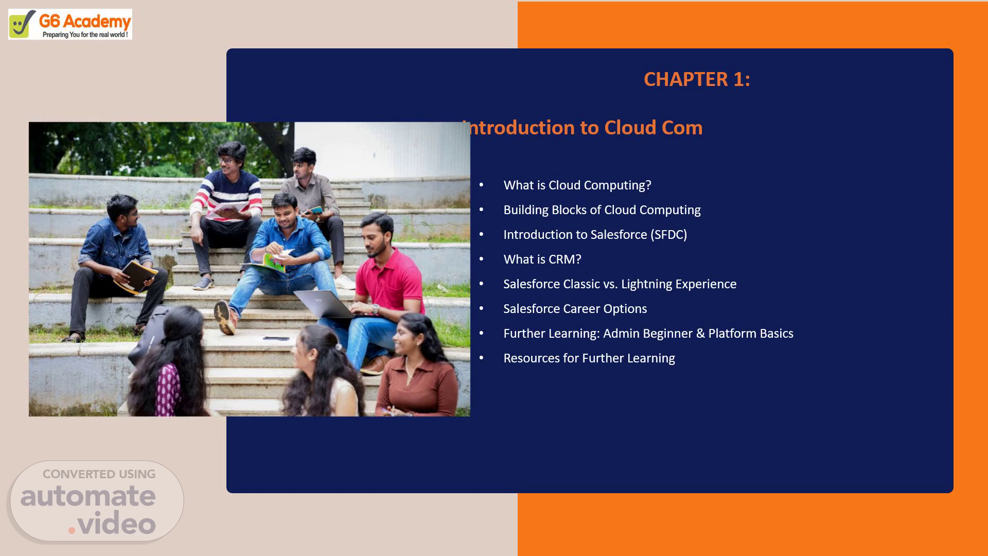 [Audio] In our twelfth slide, we will closely examine the fundamentals of Cloud Computing and Salesforce. This will cover the purpose of CRM and the different options offered by Salesforce, as well as resources for expanding our knowledge on the topic. Cloud Computing has completely transformed the way we store and access data, making it more efficient and convenient. Salesforce, a leading provider in this field, offers a range of solutions tailored for different businesses and their specific needs. One of the standout features of Salesforce is its CRM, or Customer Relationship Management, strategy. This helps businesses effectively manage and analyze customer interactions and data throughout the customer lifecycle, resulting in improved customer service and business growth. On our slide, we see a group of individuals working on their laptops in the grass, representing the collaborative and innovative nature of Cloud Computing and Salesforce. This technology allows for smooth communication and collaboration, even from a distance. However, it is worth noting that AI-generated content may occasionally be inaccurate. To stay updated on the latest developments and advancements in this field, it is crucial for us to continue learning. This leads us to our final slide, where we will explore additional resources for further education on Cloud Computing and Salesforce. Let's continue our journey towards understanding this powerful combination..