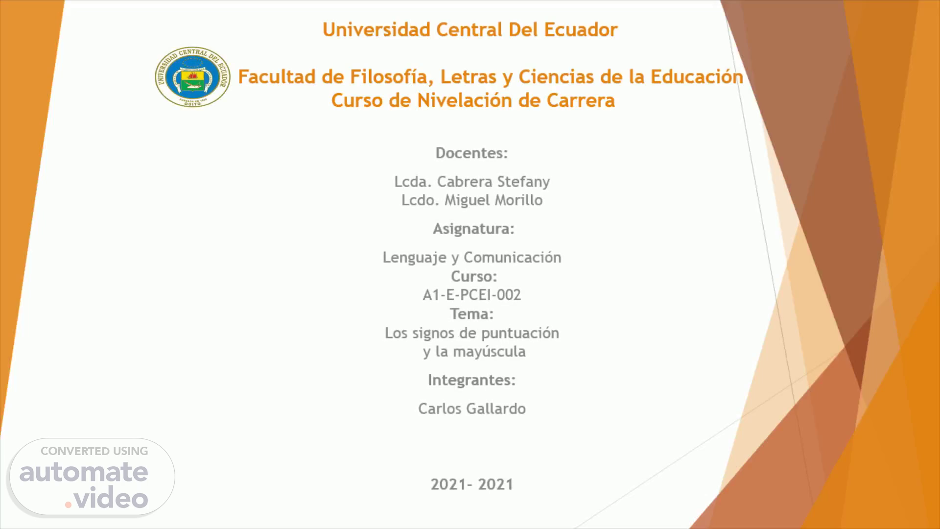 Universidad Central Del Ecuador Facultad de Filosofía, Letras y Ciencias de la Educación Curso de Nivelación de Carrera