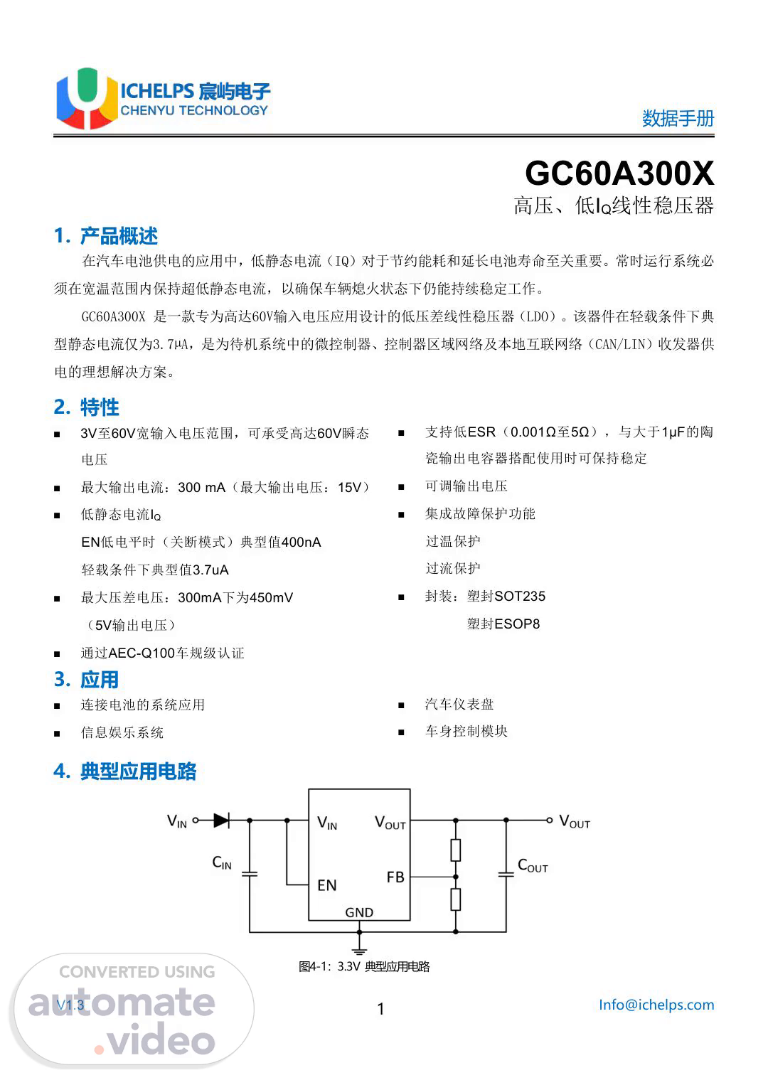 [Audio] 数据手册 GC60A300X 高压、低IQ线性稳压器 1. 产品概述 在汽车电池供电的应用中,低静态电流(IQ)对于节约能耗和延长电池寿命至关重要。常时运行系统必 须在宽温范围内保持超低静态电流,以确保车辆熄火状态下仍能持续稳定工作。 GC60A300X 是一款专为高达60V输入电压应用设计的低压差线性稳压器(LDO)。该器件在轻载条件下典 型静态电流仅为3.7µA,是为待机系统中的微控制器、控制器区域网络及本地互联网络(CAN/LIN)收发器供 电的理想解决方案。 2. 特性  支持低ESR(0.001Ω至5Ω),与大于1µF的陶  3V至60V宽输入电压范围,可承受高达60V瞬态 瓷输出电容器搭配使用时可保持稳定 电压  可调输出电压  最大输出电流:300 mA(最大输出电压:15V)  集成故障保护功能  低静态电流IQ 过温保护 EN低电平时(关断模式)典型值400nA 过流保护 轻载条件下典型值3.7uA  封装:塑封SOT235  最大压差电压:300mA下为450mV 塑封ESOP8 (5V输出电压)  通过AEC-Q100车规级认证 3. 应用  汽车仪表盘  连接电池的系统应用  车身控制模块  信息娱乐系统 4. 典型应用电路 图4-1:3.3V 典型应用电路 1 V1.3 [email protected].