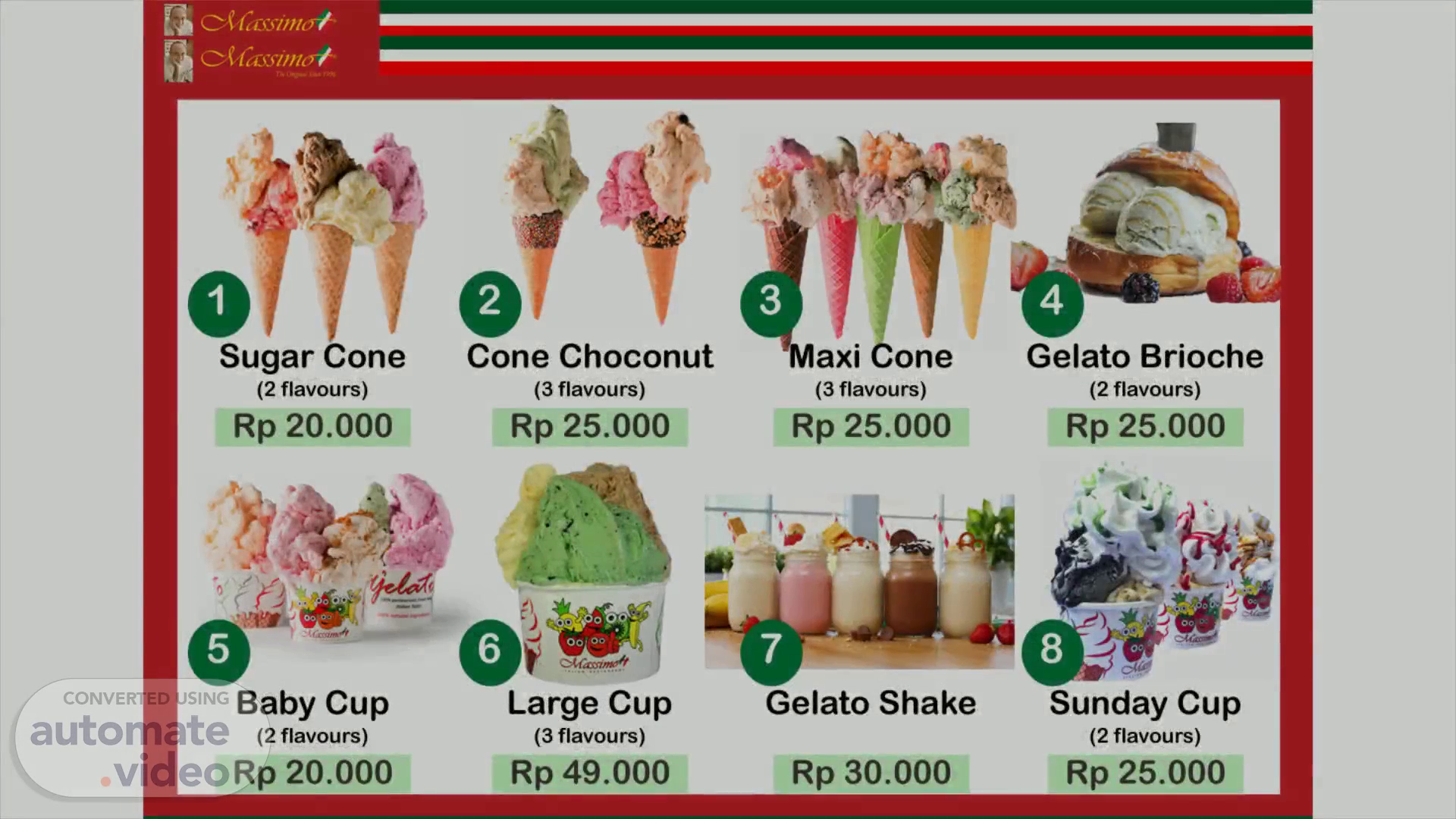 elfasszmo+: Sugar one (2 flavours) Rp 20.000 Baby Cup (2 flavours) Rp 20.000 Cone Choconut axi one Gelato Brioche (3 flavours) Rp 25.000 00 oo Large Cup (3 flavours) Rp 49.000 (3 flavours) Rp 25.000 Gelato Shake Rp 30.000 (2 flavours) Rp 25.000 Pizza I Calzone I Arancini Rp 10.000.