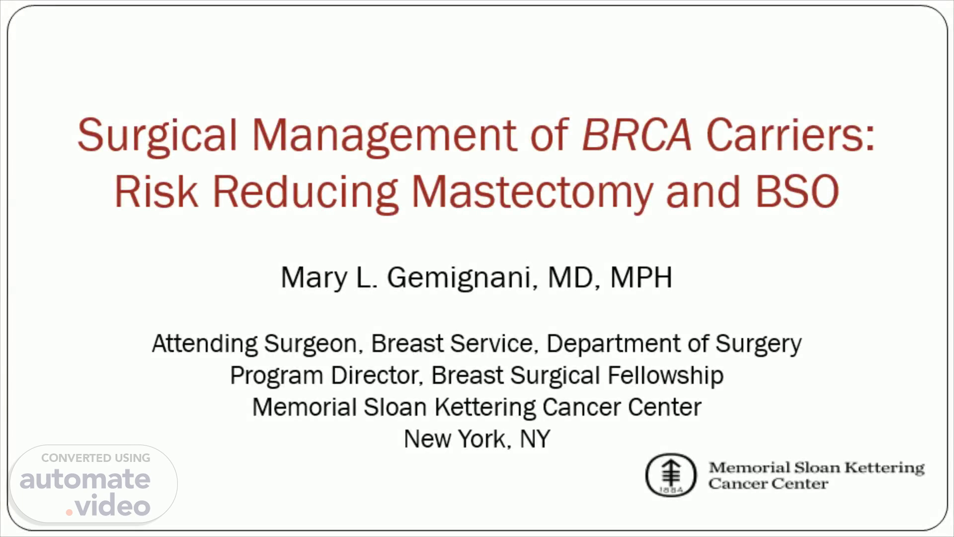 [Audio] I would like to thank Dr. El Tamer and Dr. Albashir for the invitation to participate in the 5th International Multidisciplinary Breast Conference. I will be discussing surgical management of BRCA carriers..