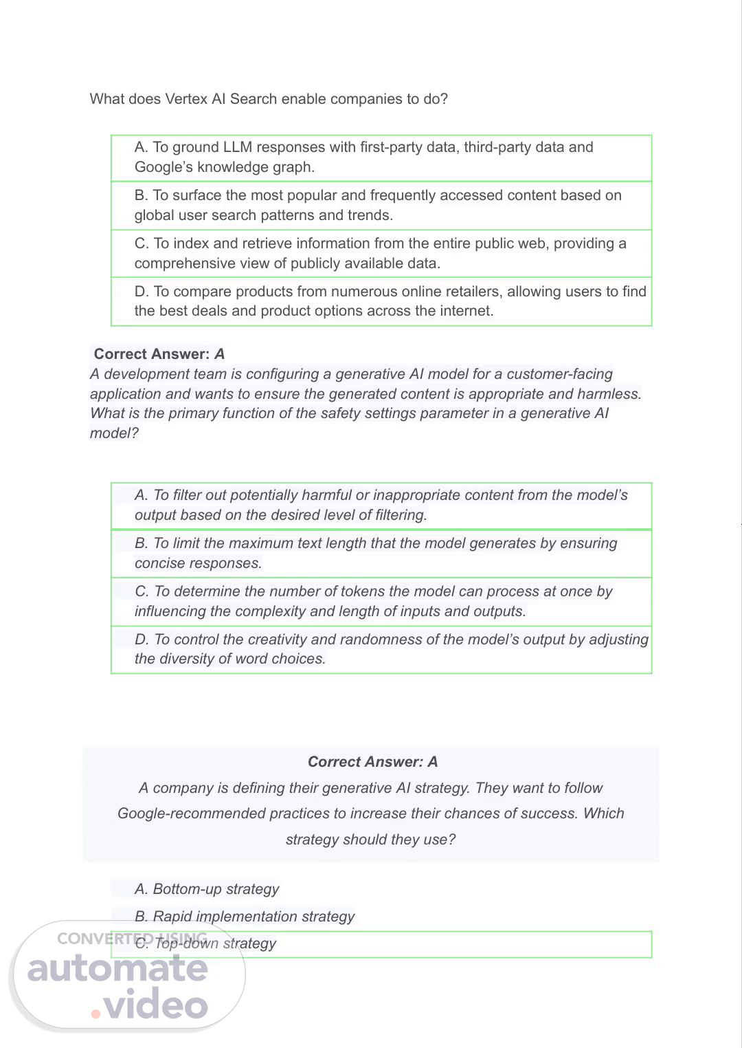 [Audio] What does Vertex AI Search enable companies to do? A. To ground LLM responses with first-party data, third-party data and Google's knowledge graph. B. To surface the most popular and frequently accessed content based on global user search patterns and trends. C. To index and retrieve information from the entire public web, providing a comprehensive view of publicly available data. D. To compare products from numerous online retailers, allowing users to find the best deals and product options across the internet. Correct Answer: A A development team is configuring a generative AI model for a customer-facing application and wants to ensure the generated content is appropriate and harmless. What is the primary function of the safety settings parameter in a generative AI model? A. To filter out potentially harmful or inappropriate content from the model's output based on the desired level of filtering. B. To limit the maximum text length that the model generates by ensuring concise responses. C. To determine the number of tokens the model can process at once by influencing the complexity and length of inputs and outputs. D. To control the creativity and randomness of the model's output by adjusting the diversity of word choices. Correct Answer: A A company is defining their generative AI strategy. They want to follow Google-recommended practices to increase their chances of success. Which strategy should they use? A. Bottom-up strategy B. Rapid implementation strategy C. Top-down strategy.