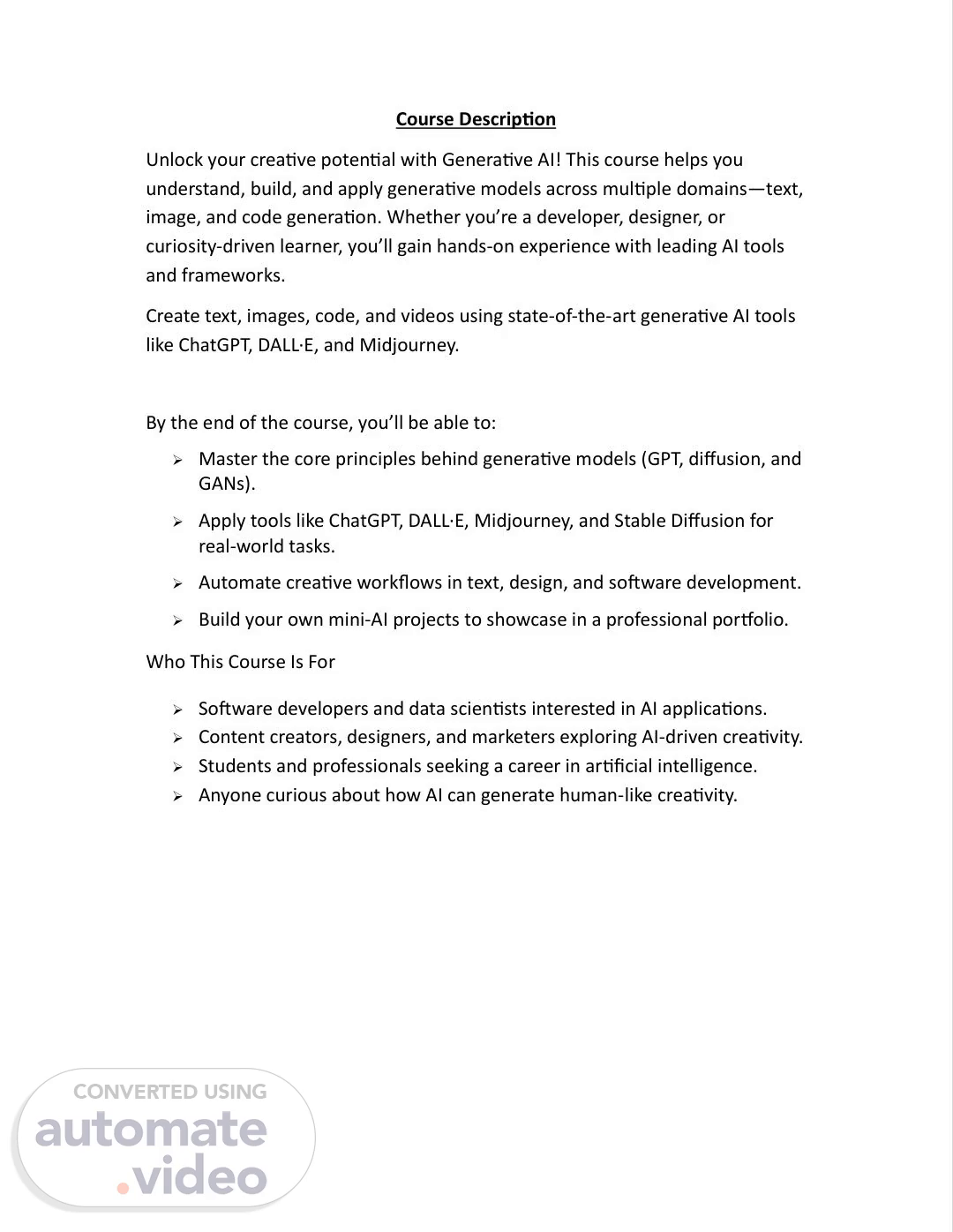 [Audio] Course Descrip�on Unlock your crea�ve poten�al with Genera�ve AI! This course helps you understand, build, and apply genera�ve models across mul�ple domains—text, image, and code genera�on. Whether you're a developer, designer, or curiosity-driven learner, you'll gain hands-on experience with leading AI tools and frameworks. Create text, images, code, and videos using state-of-the-art genera�ve AI tools like ChatGPT, DALL·E, and Midjourney. By the end of the course, you'll be able to:  Master the core principles behind genera�ve models (GPT, diffusion, and GANs).  Apply tools like ChatGPT, DALL·E, Midjourney, and Stable Diffusion for real-world tasks.  Automate crea�ve workflows in text, design, and so�ware development.  Build your own mini-AI projects to showcase in a professional por�olio. Who This Course Is For  So�ware developers and data scien�sts interested in AI applica�ons.  Content creators, designers, and marketers exploring AI-driven crea�vity.  Students and professionals seeking a career in ar�ficial intelligence.  Anyone curious about how AI can generate human-like crea�vity..