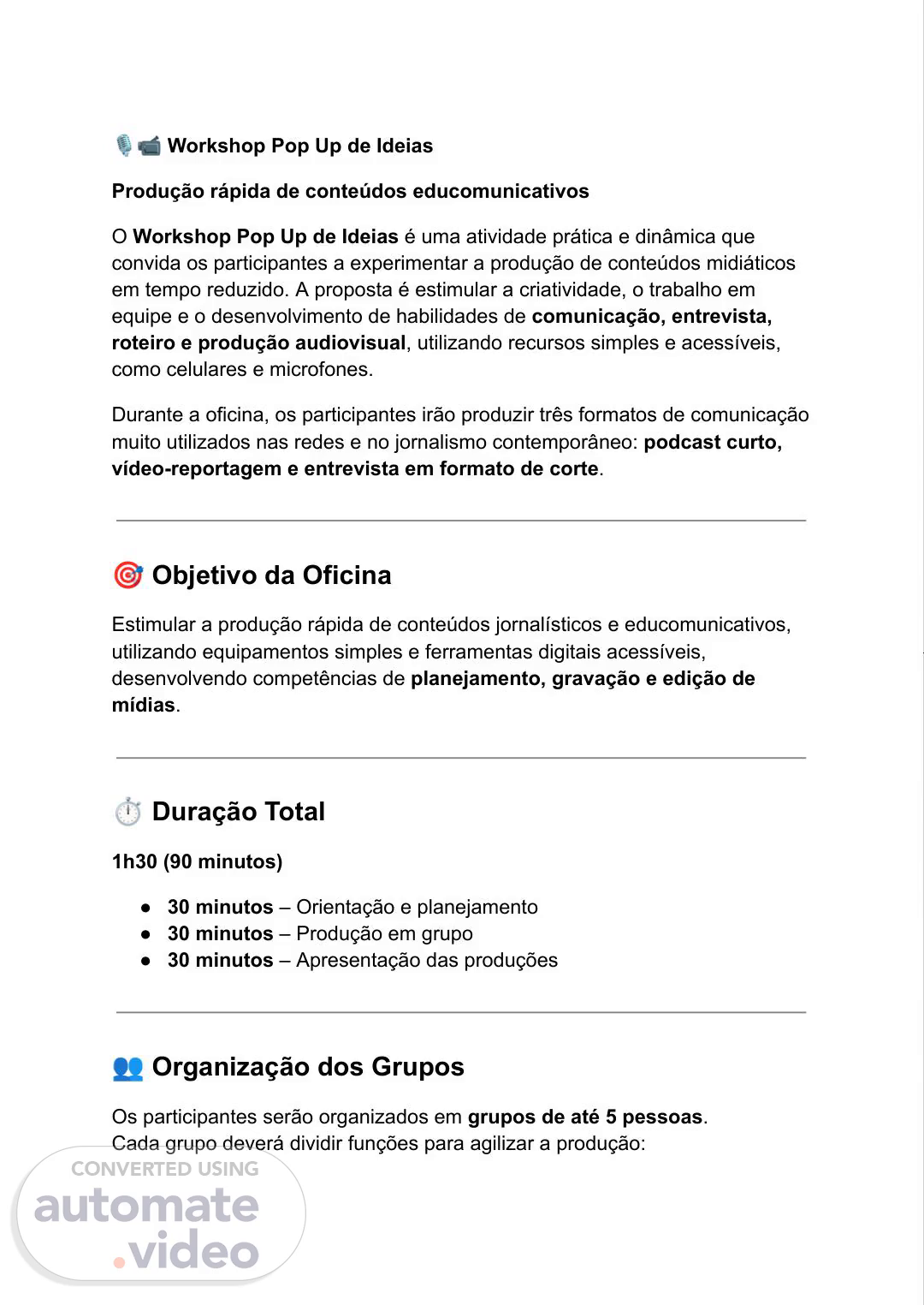 [Audio] Workshop Pop Up de Ideias Produção rápida de conteúdos educomunicativos O Workshop Pop Up de Ideias é uma atividade prática e dinâmica que convida os participantes a experimentar a produção de conteúdos midiáticos em tempo reduzido. A proposta é estimular a criatividade, o trabalho em equipe e o desenvolvimento de habilidades de comunicação, entrevista, roteiro e produção audiovisual, utilizando recursos simples e acessíveis, como celulares e microfones. Durante a oficina, os participantes irão produzir três formatos de comunicação muito utilizados nas redes e no jornalismo contemporâneo: podcast curto, vídeo-reportagem e entrevista em formato de corte. Objetivo da Oficina Estimular a produção rápida de conteúdos jornalísticos e educomunicativos, utilizando equipamentos simples e ferramentas digitais acessíveis, desenvolvendo competências de planejamento, gravação e edição de mídias. ⏱ Duração Total 1h30 (90 minutos) 30 minutos – Orientação e planejamento 30 minutos – Produção em grupo 30 minutos – Apresentação das produções Organização dos Grupos Os participantes serão organizados em grupos de até 5 pessoas. Cada grupo deverá dividir funções para agilizar a produção:.