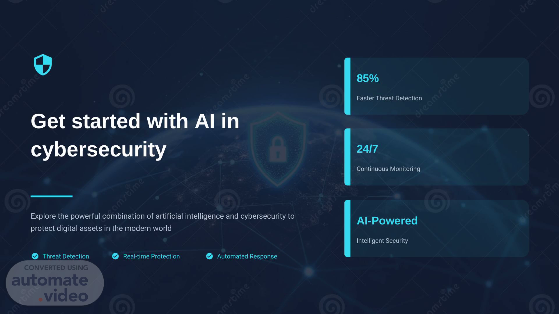 Get started with AI in cybersecurity Explore the powerful combination of artificial intelligence and cybersecurity to protect digital assets in the modern world Threat Detection Real-time Protection Automated Response 85% Faster Threat Detection 24/7 Continuous Monitoring AI-Powered Intelligent Security.