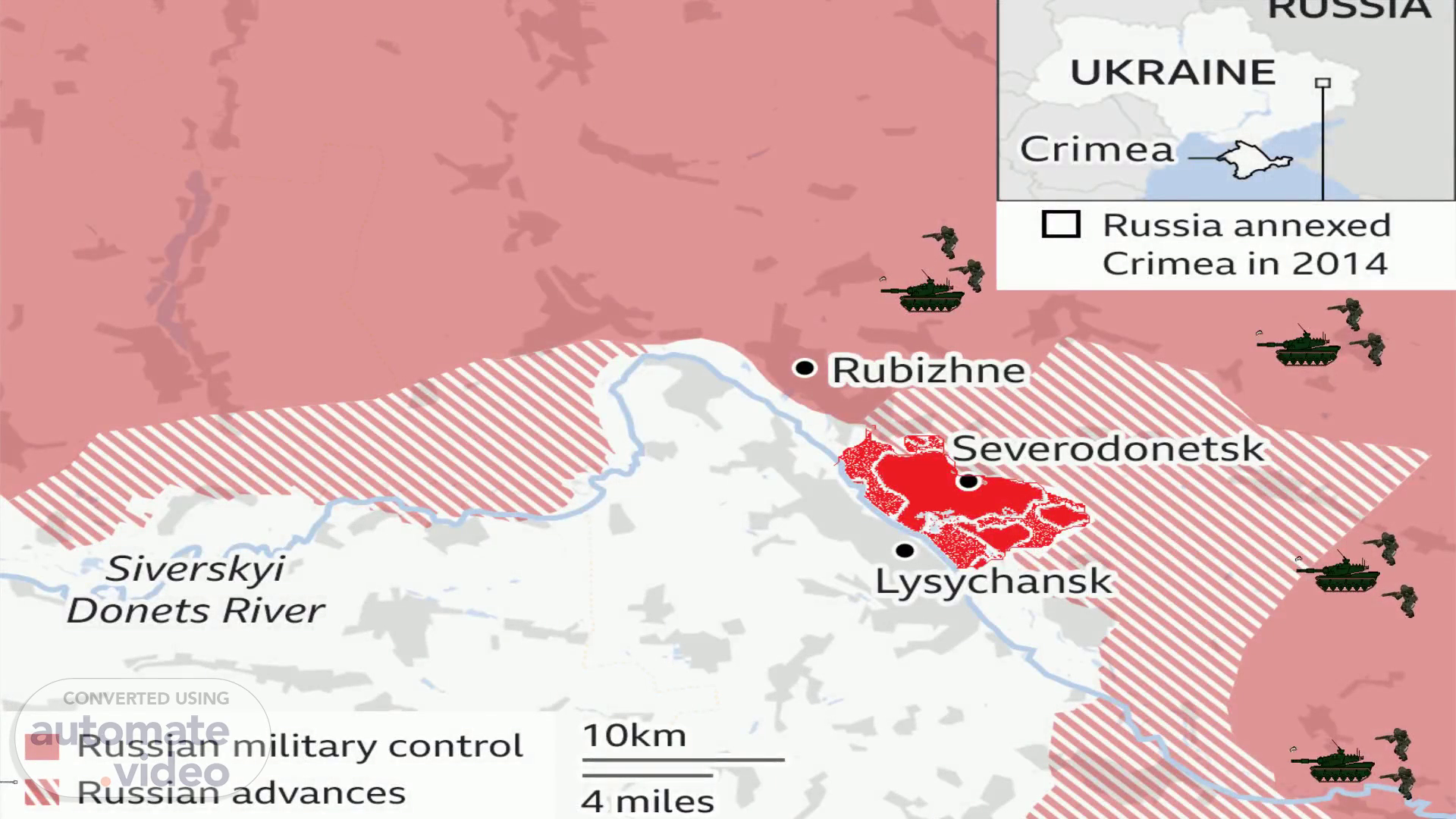 RUSSIA UKRAINE Crimea Ü Russia annexed Crimea in 2014 Rubizhhe Severodonetsk Siverskyi Donets River Russian military control Russian advances 1 Okm 4 miles Source: Institute for the Study of War (21 :OO GMT, Lysychansk 29 May) B B c.