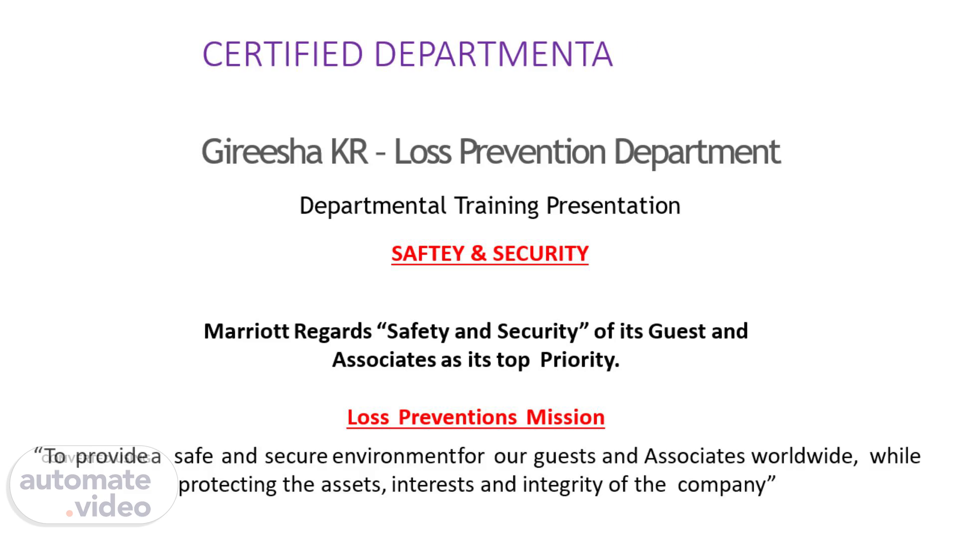 CERTIFIED DEPARTMENTAL TRAINER. Gireesha KR – Loss Prevention Department Departmental Training Presentation SAFTEY & SECURITY Marriott Regards “Safety and Security” of its Guest and Associates as its top Priority. Loss Preventions Mission “To provide a safe and secure environment for our guests and Associates worldwide, while protecting the assets, interests and integrity of the company”.