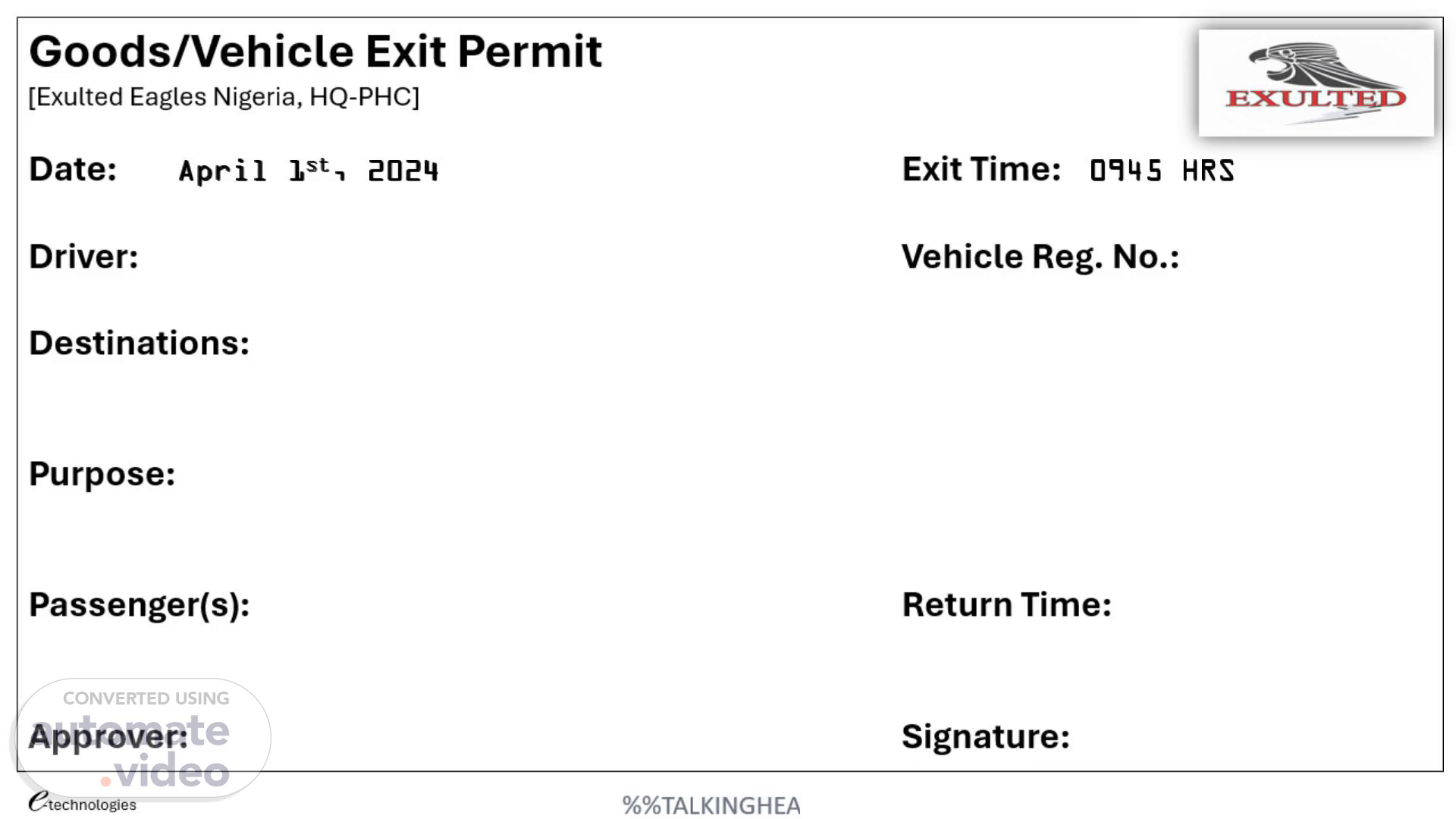 Goods/Vehicle Exit Permit [Exulted Eagles Nigeria, HQ-PHC] Date: Exit Time: Driver: Vehicle Reg. No.: Destinations: Purpose: Passenger(s): Return Time: Approver: Signature:.