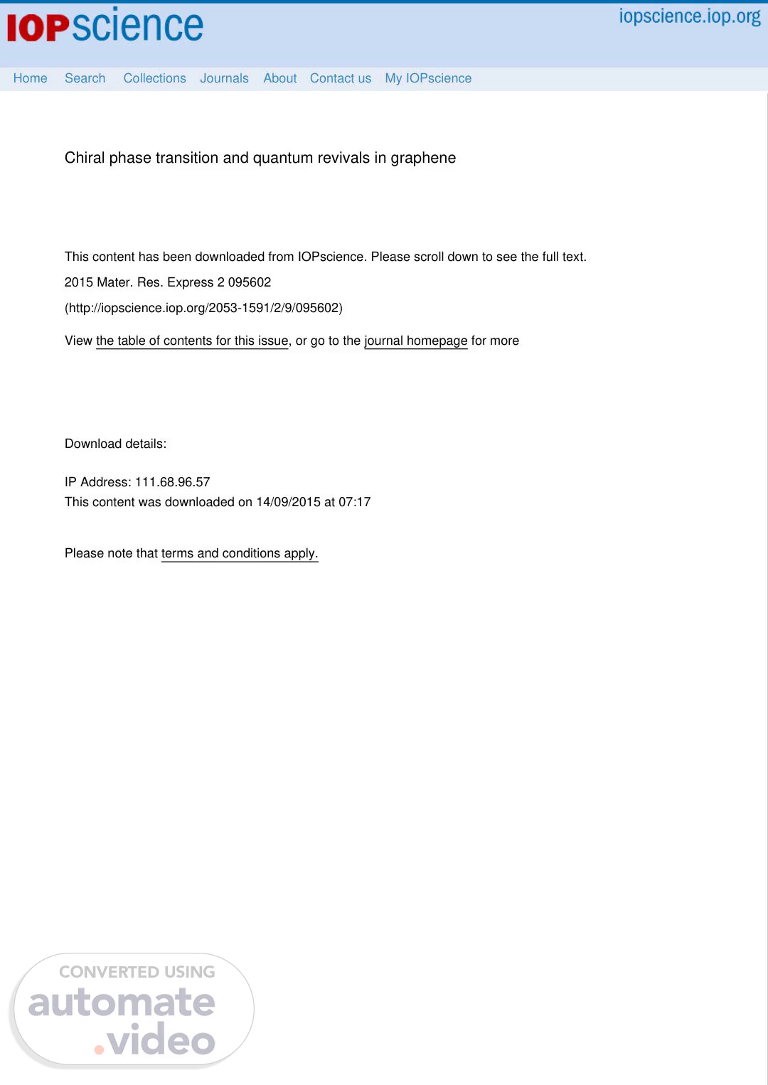 This content has been downloaded from IOPscience. Please scroll down to see the full text. Download details: IP Address: 111.68.96.57 This content was downloaded on 14/09/2015 at 07:17 Please note that terms and conditions apply. Chiral phase transition and quantum revivals in graphene View the table of contents for this issue, or go to the journal homepage for more 2015 Mater. Res. Express 2 095602 (http://iopscience.iop.org/2053-1591/2/9/095602) Home Search Collections Journals About Contact us My IOPscience.