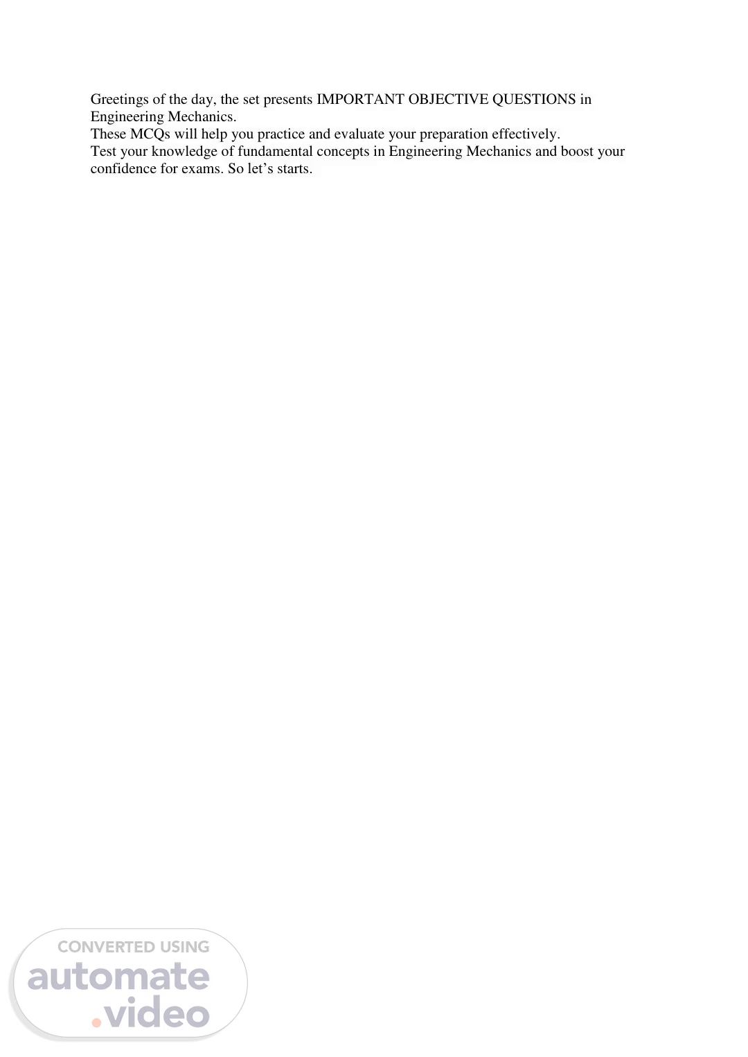 [Audio] Greetings of the day, the set presents IMPORTANT OBJECTIVE QUESTIONS in Engineering Mechanics. These MCQs will help you practice and evaluate your preparation effectively. Test your knowledge of fundamental concepts in Engineering Mechanics and boost your confidence for exams. So let's starts..