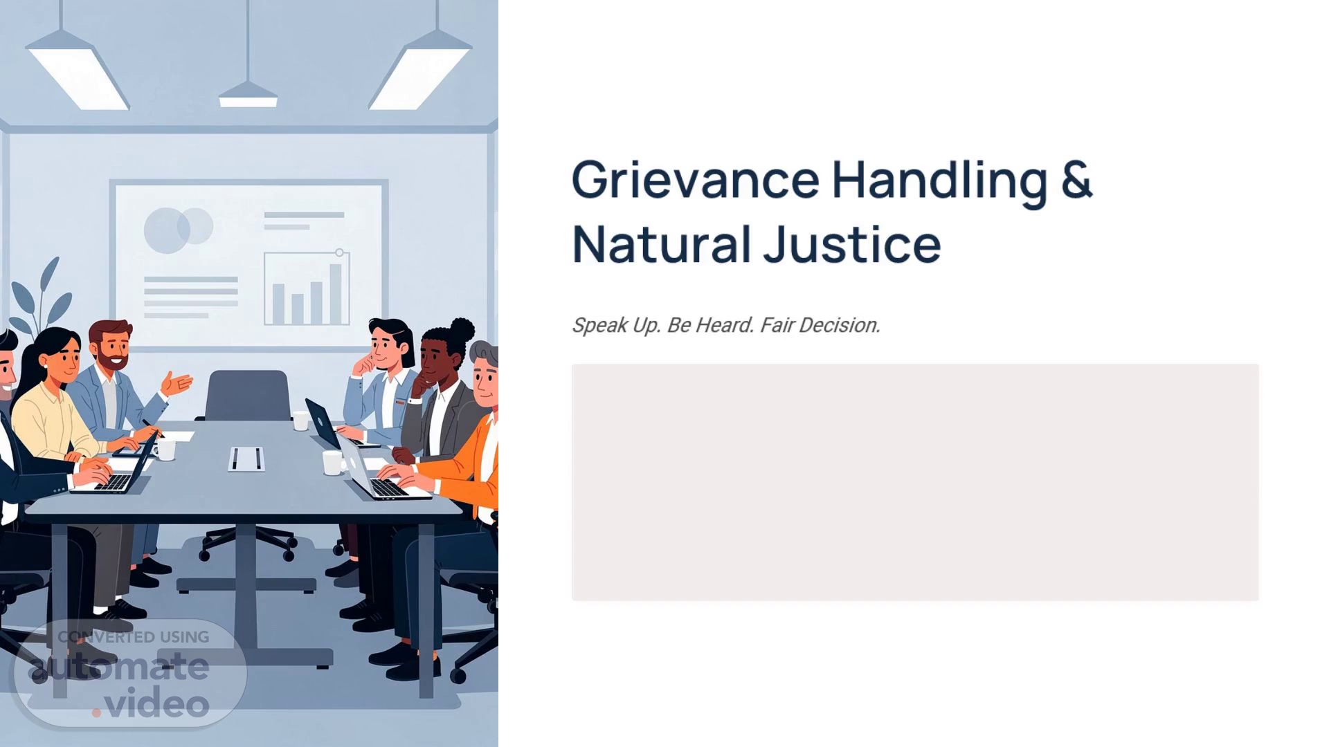 [Audio] Why does this process matter? First, it ensures fairness for everyone. Every employee should be treated equally, and decisions must be based on facts, not personal opinions or bias. Second, it provides protection for employees. A proper grievance process ensures that concerns are heard, and no one is treated unfairly or disciplined without a fair review. Third, it helps resolve issues faster. By raising concerns early and following a clear process, problems can be addressed before they escalate into bigger conflicts. Finally, it reduces legal and workplace risks. When issues are handled properly, the company can avoid disputes, complaints to external authorities, and potential legal action. In summary, a fair process builds trust, promotes respect, and creates a better workplace for everyone..