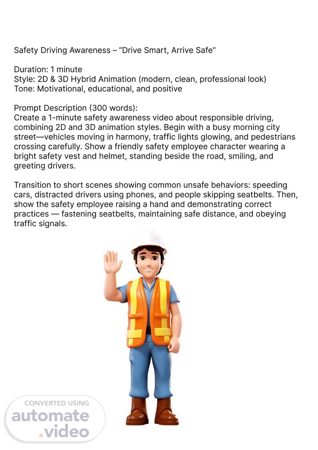 Safety Driving Awareness - "Drive Smart, Arrive Safe" Duration: 1 minute Style: 2D & 3D Hybrid Animation (modern, clean, professional look) Tone: Motivational, educational, and positive Prompt Description (300 words): Create a I-minute safety awareness video about responsible driving, combining 2D and 3D animation styles. Begin with a busy morning city street—vehicles moving in harmony, traffic lights glowing, and pedestrians crossing carefully. Show a friendly safety employee character wearing a bright safety vest and helmet, standing beside the road, smiling, and greeting drivers. Transition to short scenes showing common unsafe behaviors: speeding cars, distracted drivers using phones, and people skipping seatbelts. Then, show the safety employee raising a hand and demonstrating correct practices — fastening seatbelts, maintaining safe distance, and obeying traffic signals..