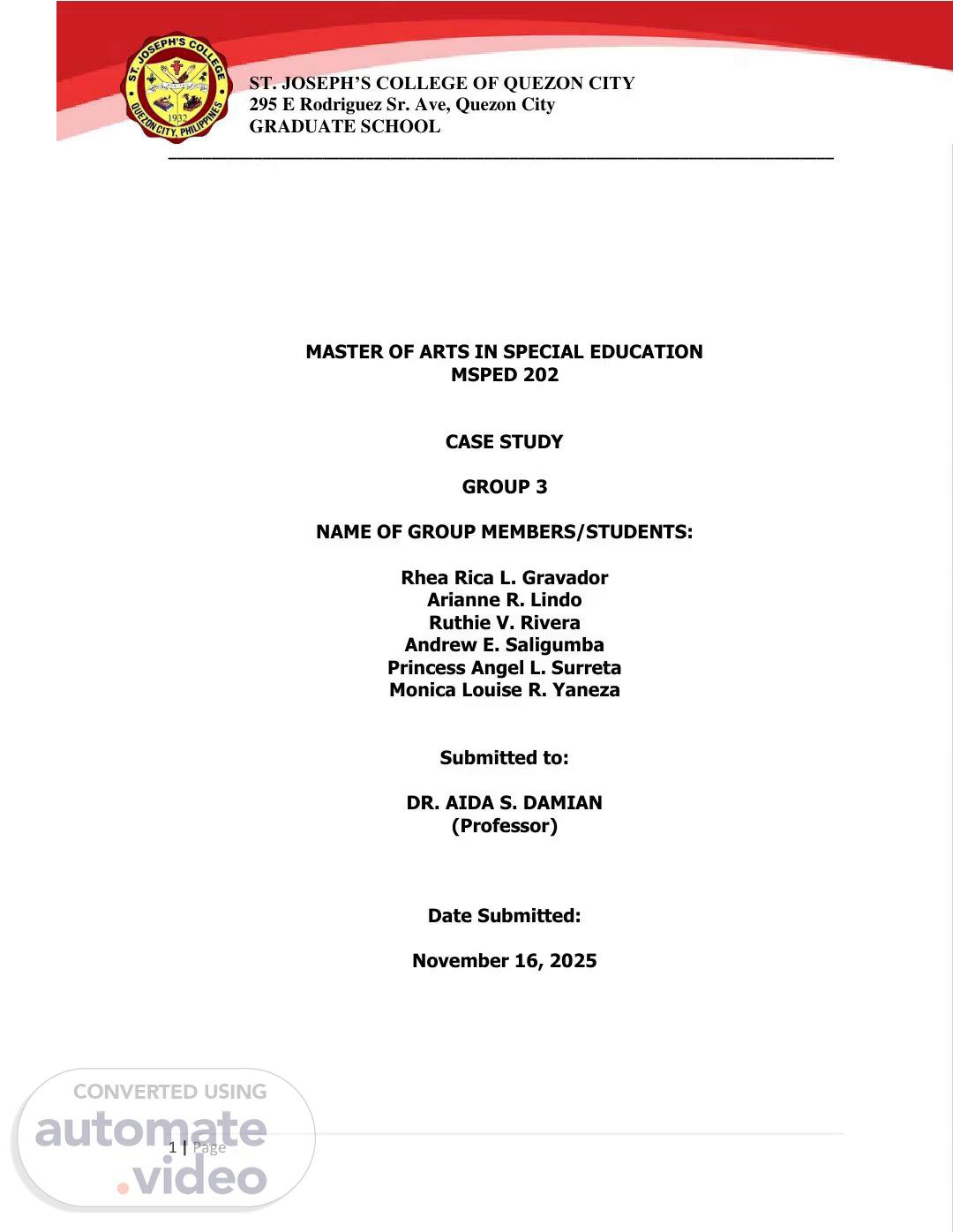 ______________________________________________________________________________ 1 | Page ST. JOSEPH’S COLLEGE OF QUEZON CITY 295 E Rodriguez Sr. Ave, Quezon City GRADUATE SCHOOL MASTER OF ARTS IN SPECIAL EDUCATION MSPED 202 CASE STUDY GROUP 3 NAME OF GROUP MEMBERS/STUDENTS: Rhea Rica L. Gravador Arianne R. Lindo Ruthie V. Rivera Andrew E. Saligumba Princess Angel L. Surreta Monica Louise R. Yaneza Submitted to: DR. AIDA S. DAMIAN (Professor) Date Submitted: November 16, 2025.