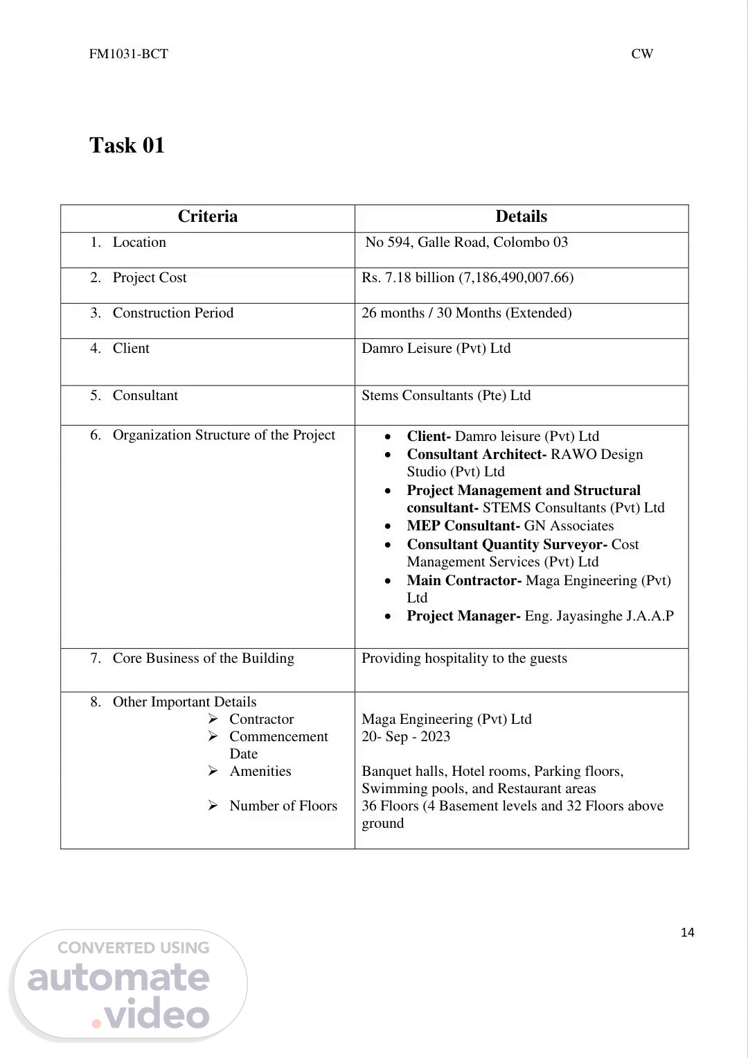FM1031-BCT CW 14 Task 01 Criteria Details 1. Location No 594, Galle Road, Colombo 03 2. Project Cost Rs. 7.18 billion (7,186,490,007.66) 3. Construction Period 26 months / 30 Months (Extended) 4. Client Damro Leisure (Pvt) Ltd 5. Consultant Stems Consultants (Pte) Ltd 6. Organization Structure of the Project • Client- Damro leisure (Pvt) Ltd • Consultant Architect- RAWO Design Studio (Pvt) Ltd • Project Management and Structural consultant- STEMS Consultants (Pvt) Ltd • MEP Consultant- GN Associates • Consultant Quantity Surveyor- Cost Management Services (Pvt) Ltd • Main Contractor- Maga Engineering (Pvt) Ltd • Project Manager- Eng. Jayasinghe J.A.A.P 7. Core Business of the Building Providing hospitality to the guests 8. Other Important Details ➢ Contractor ➢ Commencement Date ➢ Amenities ➢ Number of Floors Maga Engineering (Pvt) Ltd 20- Sep - 2023 Banquet halls, Hotel rooms, Parking floors, Swimming pools, and Restaurant areas 36 Floors (4 Basement levels and 32 Floors above ground.